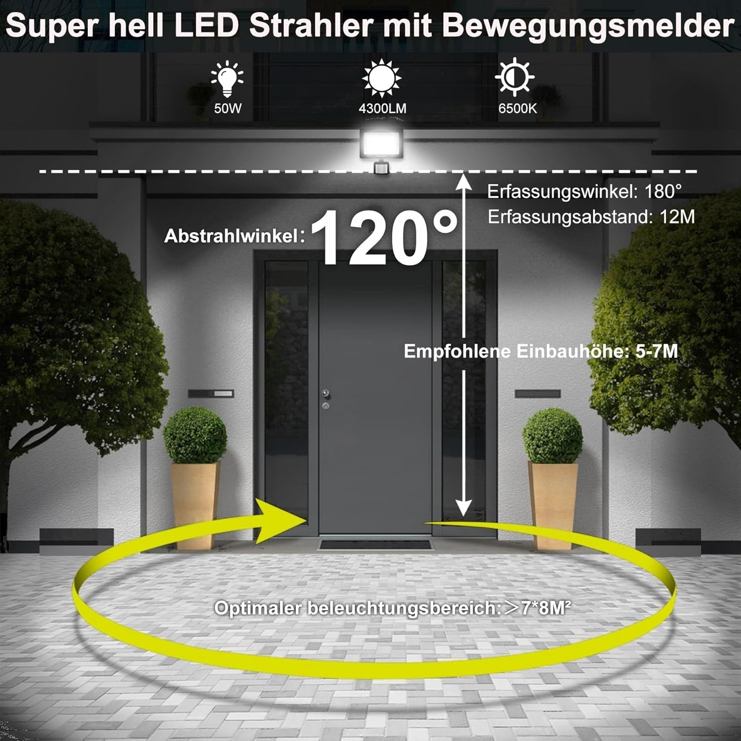 【Super jasny i energooszczędny】Reflektor zewnętrzny MEIKEE 50 W z czujnikiem ruchu wykorzystuje zaawansowaną technologię SMD, która może wytwarzać 4700 lumenów, co jest o ponad 85% bardziej energooszczędne niż żarówki o mocy 400 W. Duże, gładkie powierzchnie odblaskowe redukują niepożądane odbicia i załamania światła. Przy tej samej mocy jasność reflektorów LED Meike można zwiększyć o 30%. Ponadto kąt świecenia 120° zapewnia szeroki zakres oświetlenia.