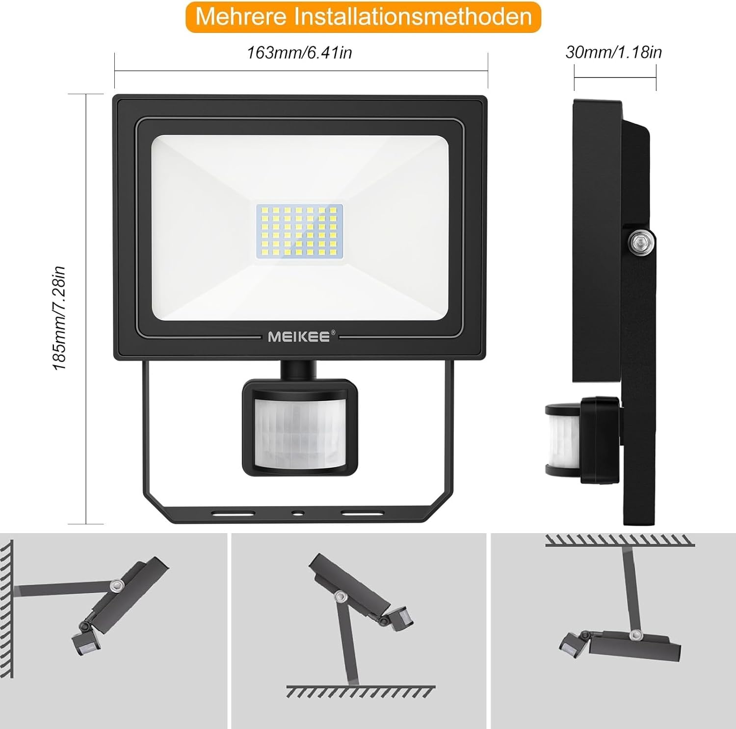 Super jasny i energooszczędny: reflektor 35 W z czujnikiem ruchu na zewnątrz firmy MEIKEE wykorzystuje zaawansowaną technologię SMD, która może wytwarzać maksymalnie 3000 lumenów i co najmniej 300 lumenów. Ponad 85% oszczędności energii niż żarówki 280 W. Duże, gładkie powierzchnie odblaskowe redukują niepożądane odbicia i załamania. Przy tej samej mocy jasność reflektora LED MEIKEE może zostać zwiększona o 30%. Ponadto kąt świecenia 120 stopni zapewnia szerokie spektrum oświetlenia