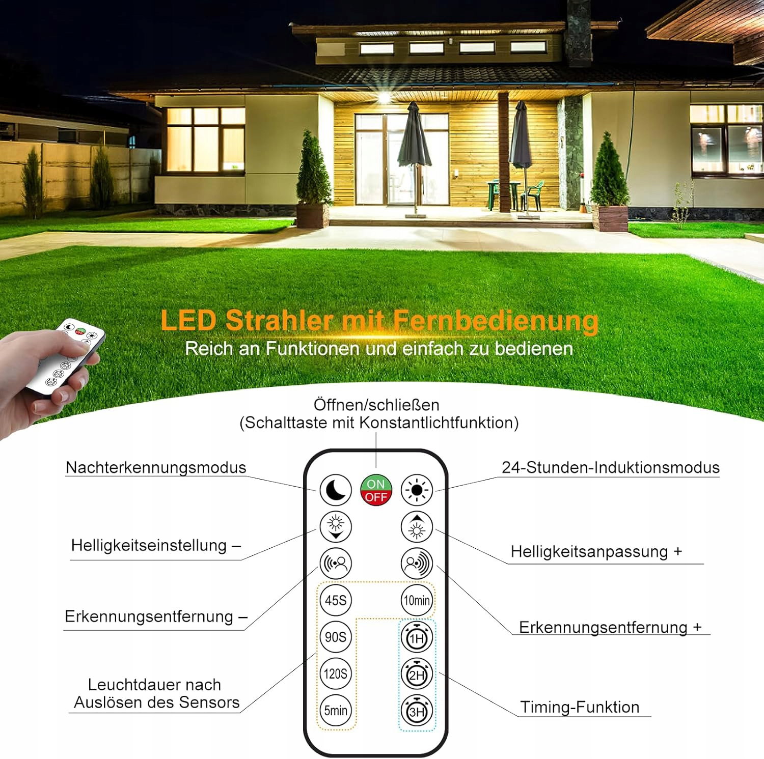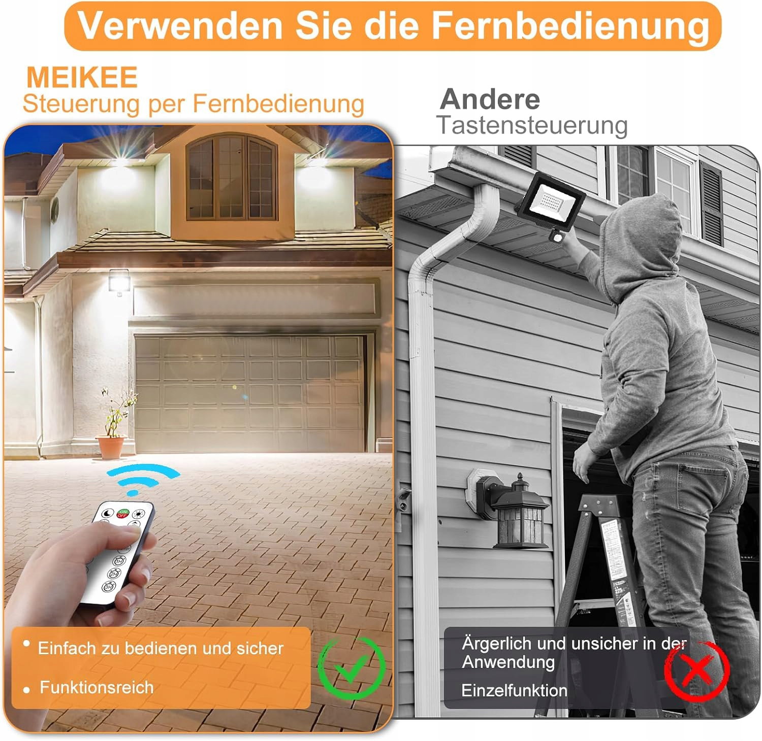 Najnowszy reflektor LED z pilotem zdalnego sterowania: najnowszy reflektor LED MEIKEE z czujnikiem ruchu jest wyposażony w pilot zdalnego sterowania, dzięki czemu można łatwiej i bezpieczniej obsługiwać reflektor zewnętrzny za pomocą pilota zdalnego sterowania, ponadto reflektor MEIKEE LED posiada więcej funkcji. Tryb światła stałego/24-godzinny tryb indukcyjny/nocny tryb indukcyjny opcjonalny; regulowana jasność; regulowana odległość wykrywania (opcjonalnie 6 m/9,6 m/12 m); regulowany czas oświetlenia indukcyjnego; funkcja timera (1H/2H/3H opcjonalnie)