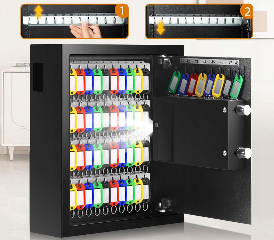 - ✴️Sejf na klucze z listwą na klucze i brelokiem do kluczy - regulowana listwa na klucze może być montowana na różnych wysokościach w zależności od rozmiaru zawieszanego klucza. Na listwie na klucze znajdują się haczyki do umieszczania kluczy, dzięki czemu można je łatwo zawiesić lub zdjąć. Skrzynka na klucze pomieści 48 kluczy. Różne kolory breloczków do kluczy można zaznaczyć, dzięki czemu można łatwo znaleźć żądany klucz.