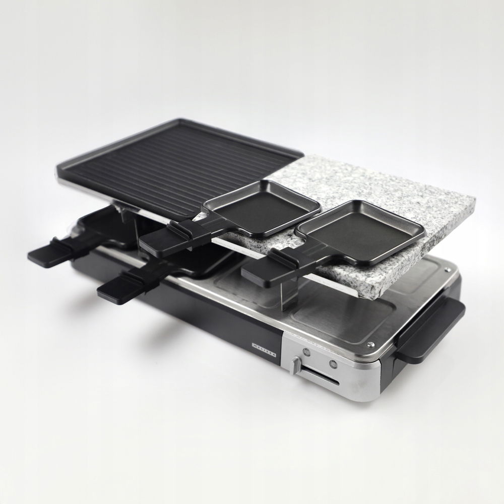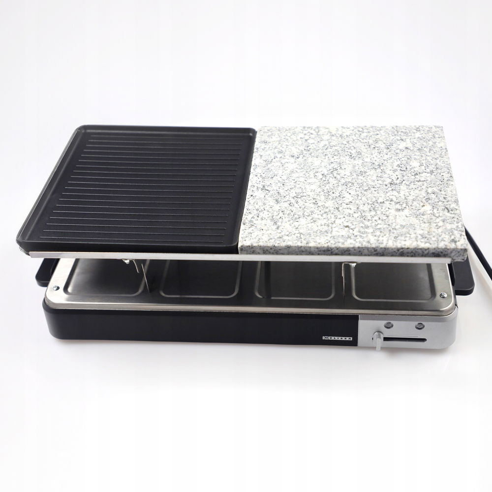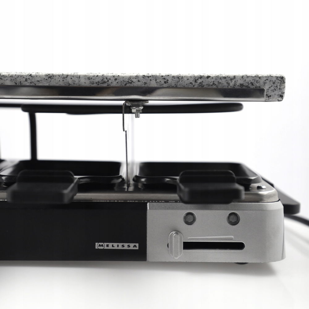 Grill Raclette Melissa wyposażony jest w wydajną płytę grillową oraz kamień do grillowania, umożliwiając jednoczesne przyrządzanie różnorodnych potraw. Nieprzywierająca powierzchnia grilla zapewnia łatwe gotowanie bez ryzyka przypalenia, a regulowany termostat pozwala na precyzyjną kontrolę temperatury. Dzięki antypoślizgowym nóżkom, grill stoi stabilnie na każdym stole, zapewniając bezpieczeństwo i komfort użytkowania.