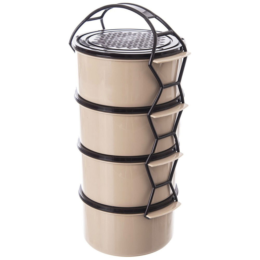 PRAKTYCZNA - Menażka do przechowywania i przenoszenia żywności 4 poziomowa. Menażka składa się z czterech osobnych pojemników scalonych w jedno naczynie. Każdy pojemnik posiada pokrywkę oraz pojemność 1,5 litra. W zestawie pokrywki oraz stelaż z uchwytem. Wysokość menażki to 31 cm a średnica 16,5 cm.