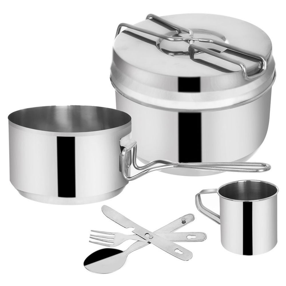 Menażka turystyczna składająca się z 7 elementów. W zestawie: 1x naczynie z składanym uchwytem (średnica 15 cm, wysokość 9 cm, poj. 1,5 l), 1x naczynie z składanym uchwytem (średnica 13 cm, wysokość 7,5 cm, poj. 0,9 l), 1x pokrywka, które może służyć jako talerz (średnica 15 cm, wysokość 3 cm), 1x kubek (7,5 cm, wysokość 8 cm, poj. 0,2 l), 1xnóż z otwieraczem, łyżka, widelec (długość 17 cm). Zestaw przydatny podczas wyjazdów za miasto, ale również pikników czy wycieczek.