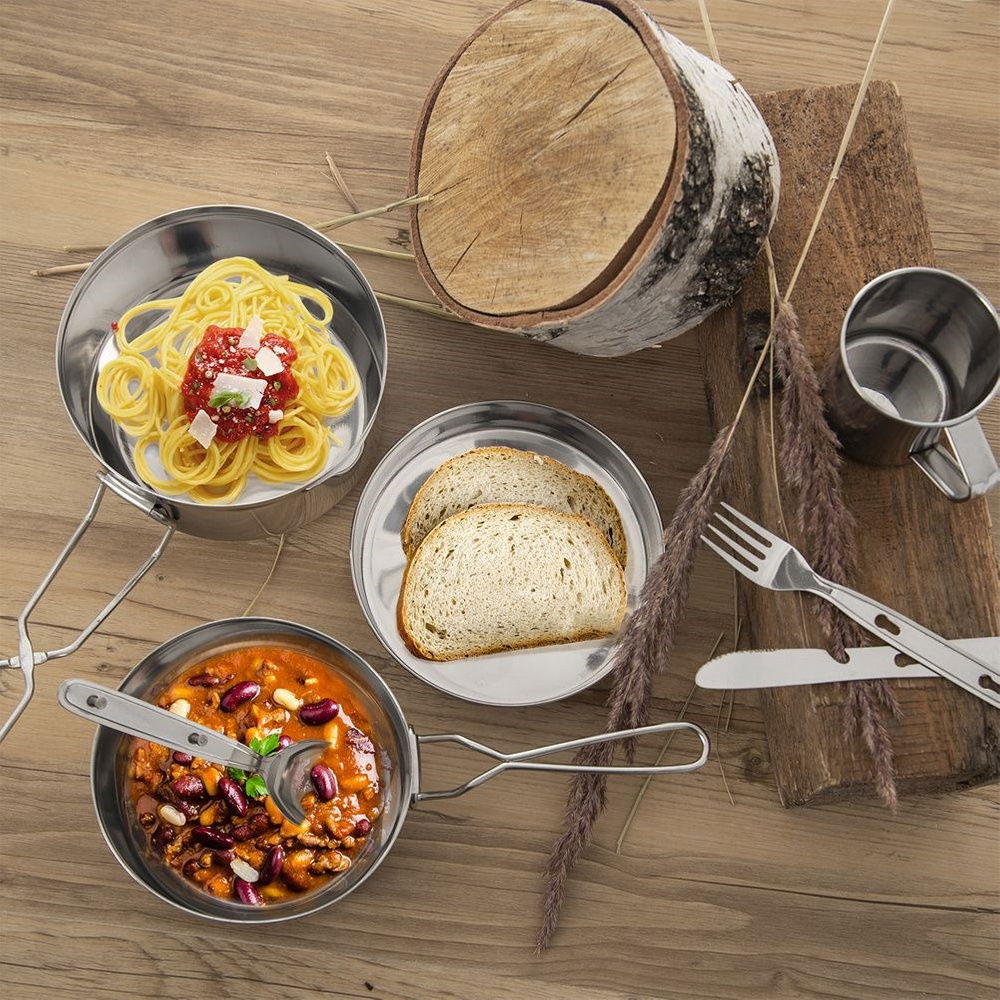 FUNKCJONALNY - Zestaw składa się z 7 elementów. Naczynia można wykorzystać również jako miskę. Nóż posiada również zakończenie, które może posłużyć jako otwieracz do butelek.