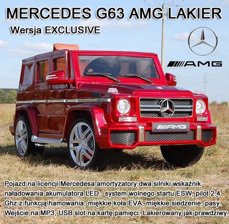 AUTO MERCEDES G63 AMG W WERSJI LAKIEROWANEJ Z MIĘKKIM SIEDZENIEM ORAZ SYSTEMEM WOLNEGO STARTU ESW - zasilane na 12 V z napędem na dwa koła oraz otwieranymi wysokimi drzwiami zachwyci nie jednego przyszłego kierowcę. Dzięki zastosowanym najmocniejszym silnikom 45 W, auto jeździ po nierównym terenie bez żadnych problemów, a dodatkowo silniki te są bardzo dobrej jakości. Ciekawym elementem jest oświetlenie pojazdu - świecące światła dzienne, włączają się od razu po uruchomieniu pojazdu oraz reflektory i światła obrysowe, którą włączamy osobnym włącznikiem gdy zrobi się np. ciemno. Auto posiada amortyzatory zarówno z przodu jak i z tyłu, które zapewniają młodemu kierowcy pełen komfort jazdy podczas jazdy w terenie. Duże miękkie koła EVA zapewniają cichą jazdę. Podświetlana deska rozdzielcza pojazdu oraz wskaźnik naładowania akumulator w formie graficznej dają pełen komfort użytkowania pojazdu - wiemy na jak długo mamy jeszcze " paliwa" ( napięcia w akumulatorach).