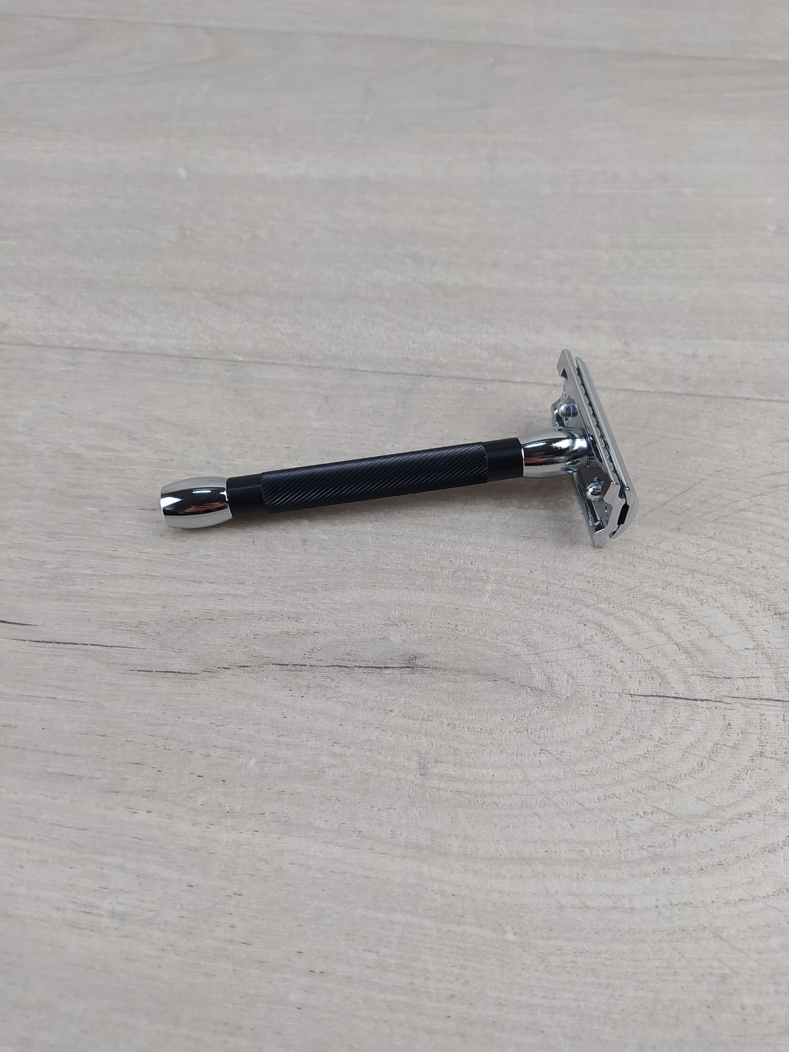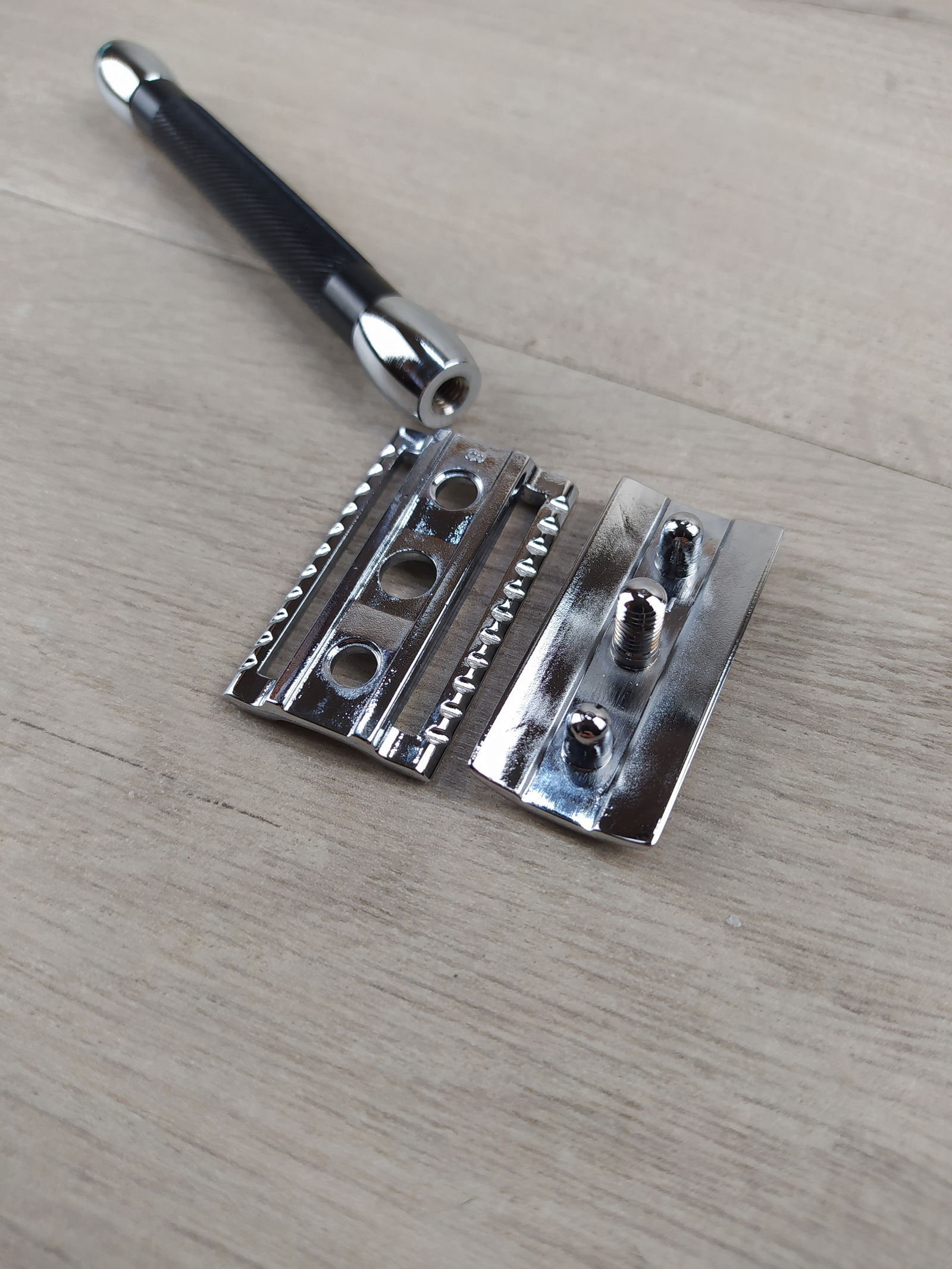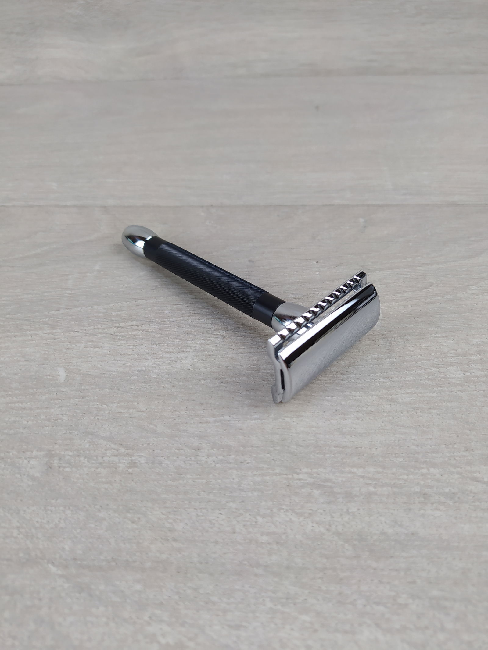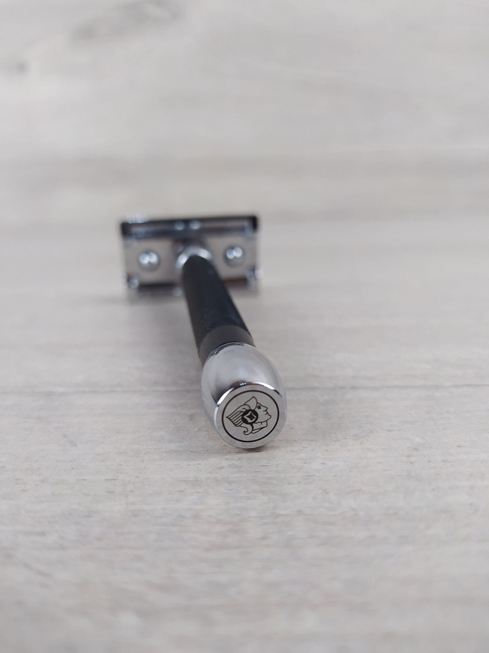 Głowica jest produkowana metodą odlewania cynkowego, co pozwala na uzyskanie bardzo precyzyjnych tolerancji produkcyjnych i skomplikowanych kształtów. Rękojeść wykonana jest z czarnego anodowanego aluminium i mosiądzu, dzięki czemu maszynka nie tylko prezentuje się wyjątkowo, ale także idealnie leży w dłoni. Powłoka galwaniczna zabezpiecza przed korozją i dopełnia design.