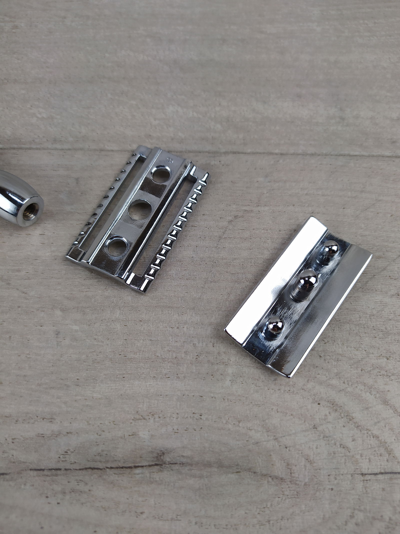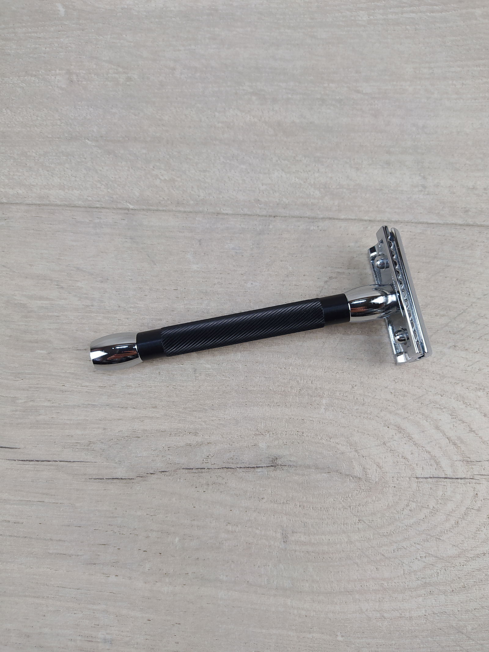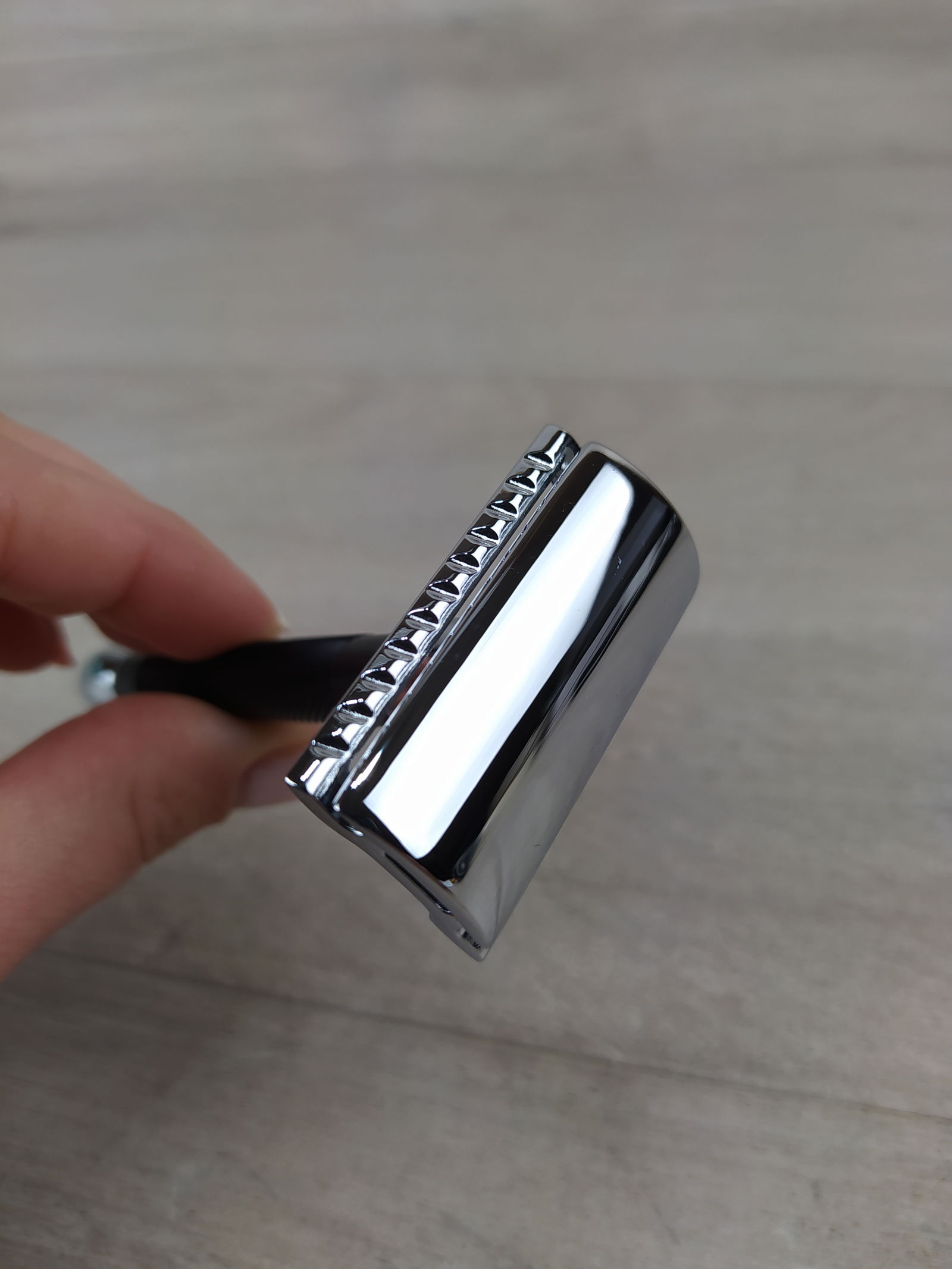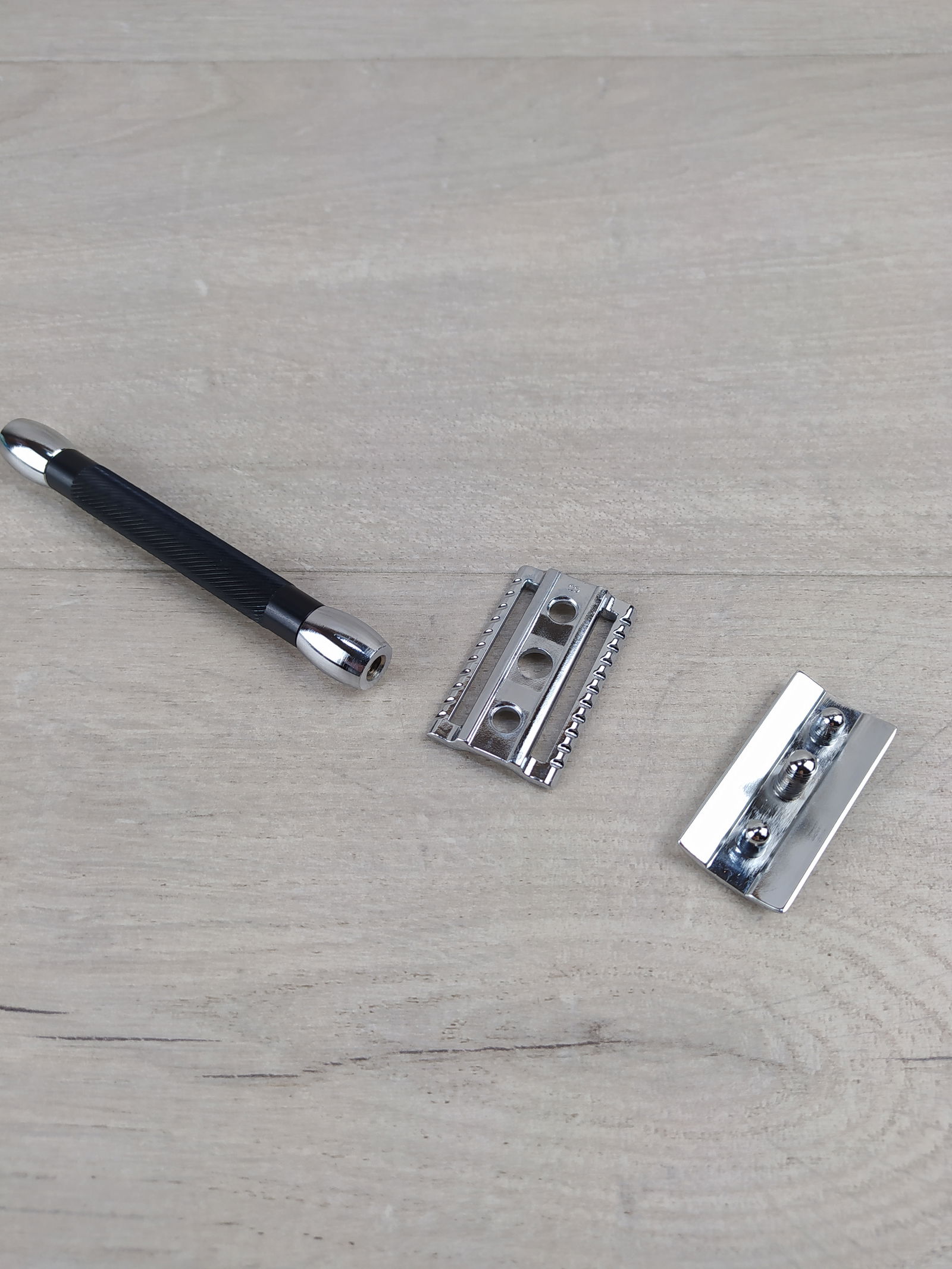 Głowica jest produkowana metodą odlewania cynkowego, co pozwala na uzyskanie bardzo precyzyjnych tolerancji produkcyjnych i skomplikowanych kształtów. Rękojeść wykonana jest z czarnego anodowanego aluminium i mosiądzu, dzięki czemu maszynka nie tylko prezentuje się wyjątkowo, ale także idealnie leży w dłoni. Powłoka galwaniczna zabezpiecza przed korozją i dopełnia design.