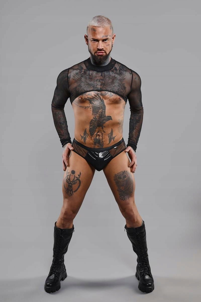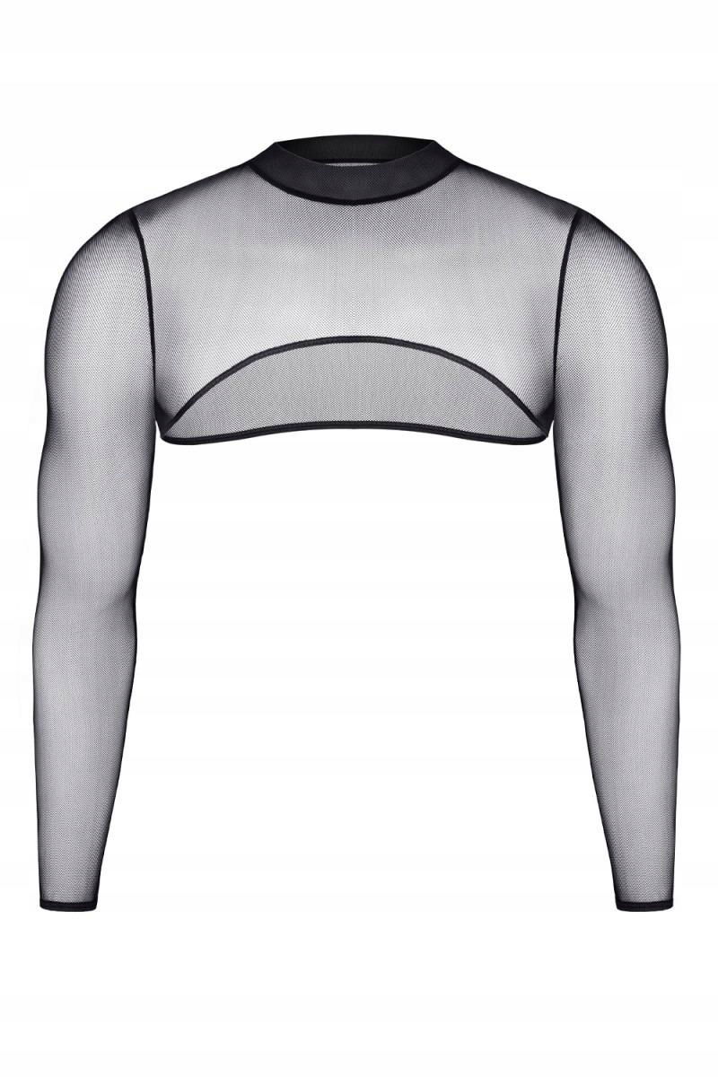 Krótki top w całości wykonany z bardzo elastycznego i sprężystego tiulu w kolorze czarnym. Efektownie poszerza barki i klatkę piersiową oraz odkrywa nagie plecy i brzuch. Na obodzie w dolnej cześci i przy rękawkach wykończony elastyczną gumką. To rozwiazanie i elastyczne cechy materiału sprawiają, że doskonale dopasowauje się do ciała - podkreślając jego walory.