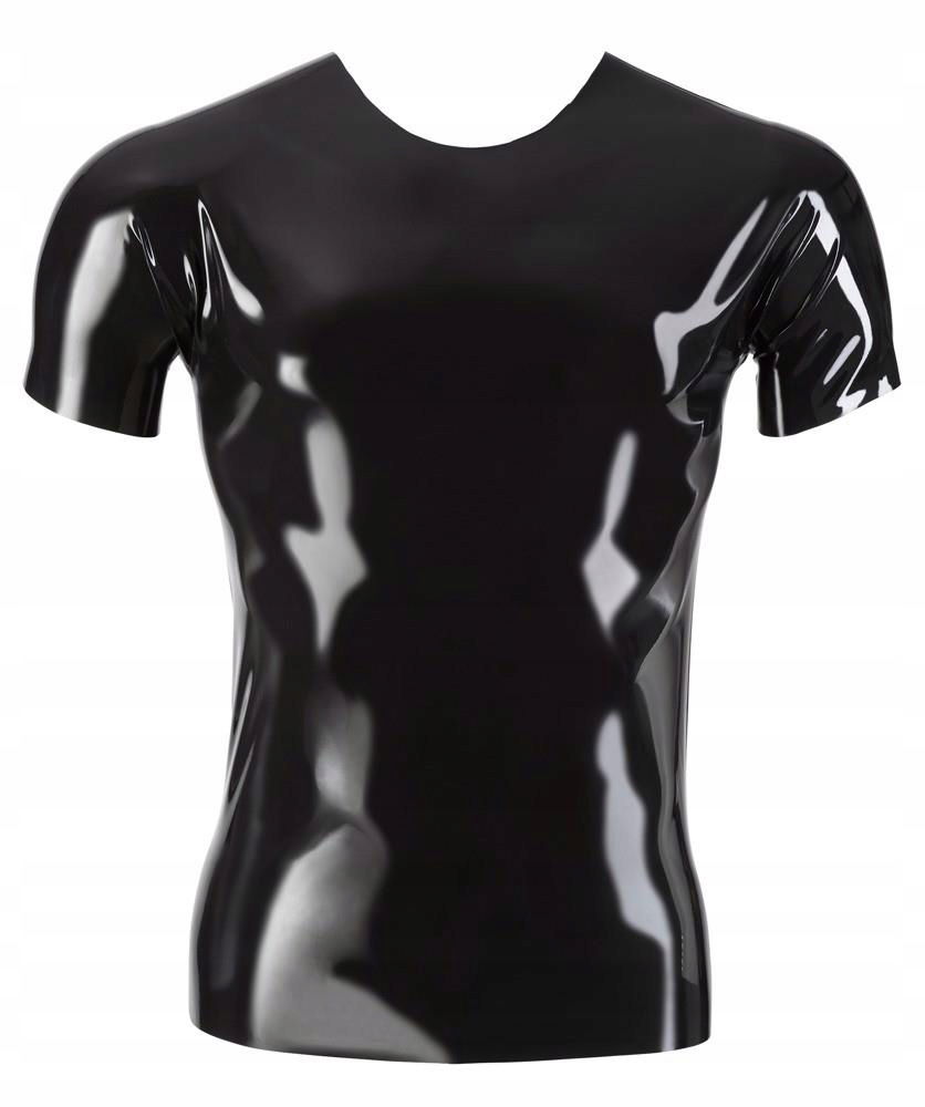 Czarna koszula unisexowa wykonana z lateksu w klasycznej, prostej formie kroju z połówkami ramion i okrągłym dekoltem. Idealna do wejścia na scenę lateksową, ponieważ koszulę można łączyć z wieloma istniejącymi strojami.