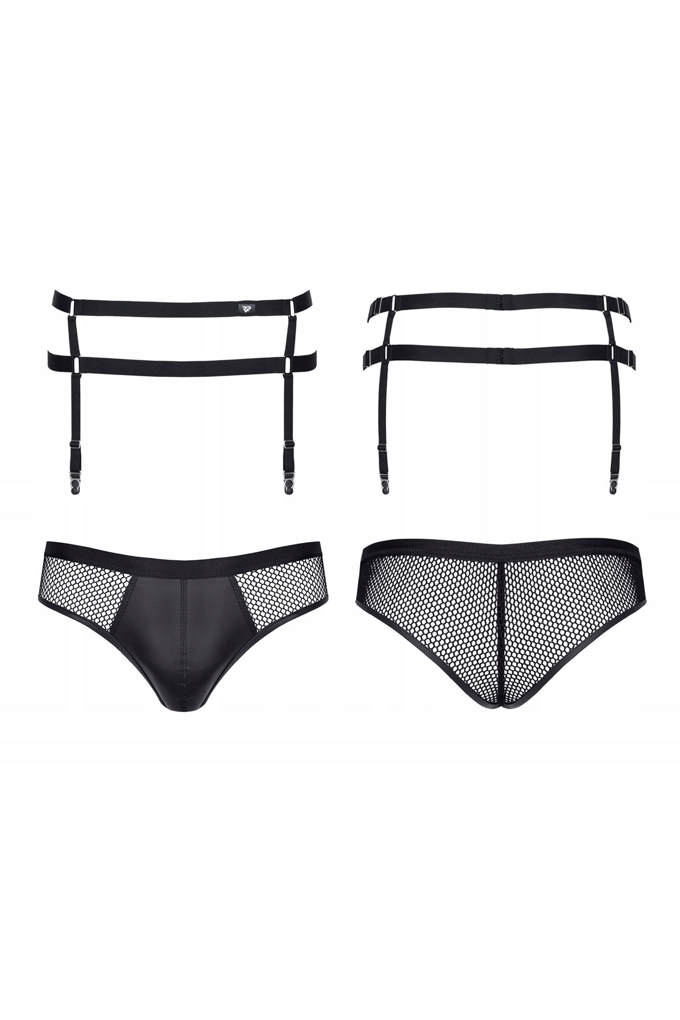 Pas do pończoch. Zestawienie miłych w dotyku gumek w kolorze czarnym z efektownymi ozdobnymi elementami. Geometryczne połączenie gumek stanowi atrakcyjną wizualnie propozycję. Zapinki do pończoch metalowe w kolorze srebrnym. Z tyłu 2 zapięcia z regulacją 2-u stopniową. Paski do pończoch ze srebrnymi regulatorami ułatwiającymi dopasowanie. Majtki z przodu z czarnego elastycznego wetlook"a, z boków i tyłu z miłej w dotyku, elastycznej siateczki. W środku kieszonka z BigBossEffect. Pięknie prezentują się na pośladkach oraz apetycznie ukazują ich wygląd przez oczka siateczki.