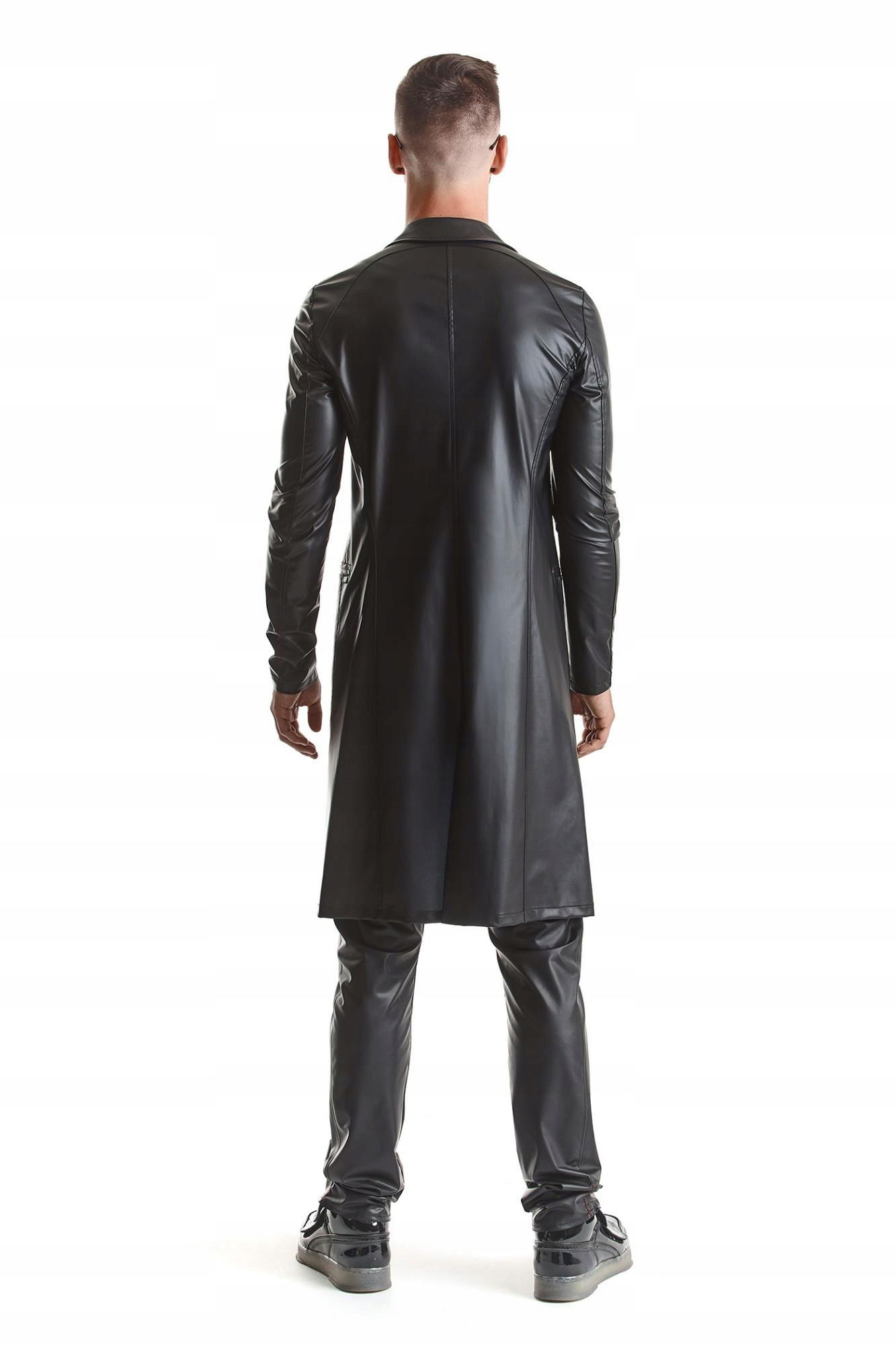 Długi, elegancki płaszcz inspirowany klasycznymi prochowcami kina Noir. Uszyty z wysokiej jakości czarnego wetlook’a. Lekko zwężona linia talii oraz poszerzona linia klatki piersiowej i pleców, nadają sylwetce masywniejszego i nieco groźnego wyglądu. Optycznie powiększają klatkę piersiową oraz plecy, jednocześnie wyszczuplając pas. Klasyczny kształt prochowca, podkreślają długie klapy oraz kołnierz. Pięknym i unikalnym elementem na plecach, jest łukowate przeszycie w górnej części płaszcza. Płaszcz doskonale nadaje się do codziennych stylizacji na spotkania w większym gronie. Pozwala tam zabłysnąć oryginalnym wyglądem poprzez odpowiednio dobraną stylizację. Posiada 2 funkcjonalne kieszenie. Czerwone przeszycia i metka z czerwonej Alcantary to miłe dla oka, wyrafinowane detale.