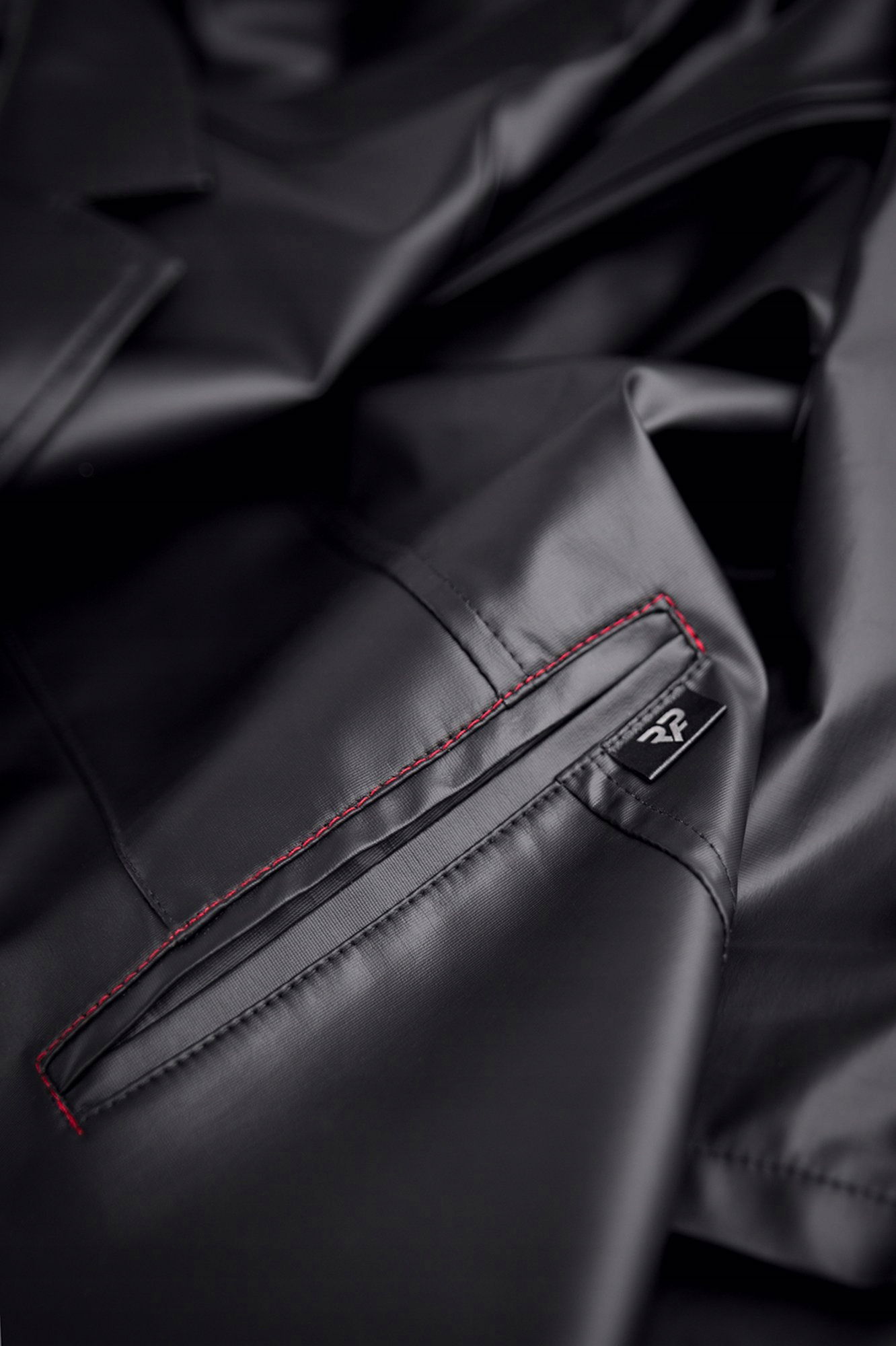 Długi, elegancki płaszcz inspirowany klasycznymi prochowcami kina Noir. Uszyty z wysokiej jakości czarnego wetlook’a. Lekko zwężona linia talii oraz poszerzona linia klatki piersiowej i pleców, nadają sylwetce masywniejszego i nieco groźnego wyglądu. Optycznie powiększają klatkę piersiową oraz plecy, jednocześnie wyszczuplając pas. Klasyczny kształt prochowca, podkreślają długie klapy oraz kołnierz. Pięknym i unikalnym elementem na plecach, jest łukowate przeszycie w górnej części płaszcza. Płaszcz doskonale nadaje się do codziennych stylizacji na spotkania w większym gronie. Pozwala tam zabłysnąć oryginalnym wyglądem poprzez odpowiednio dobraną stylizację. Posiada 2 funkcjonalne kieszenie. Czerwone przeszycia i metka z czerwonej Alcantary to miłe dla oka, wyrafinowane detale.