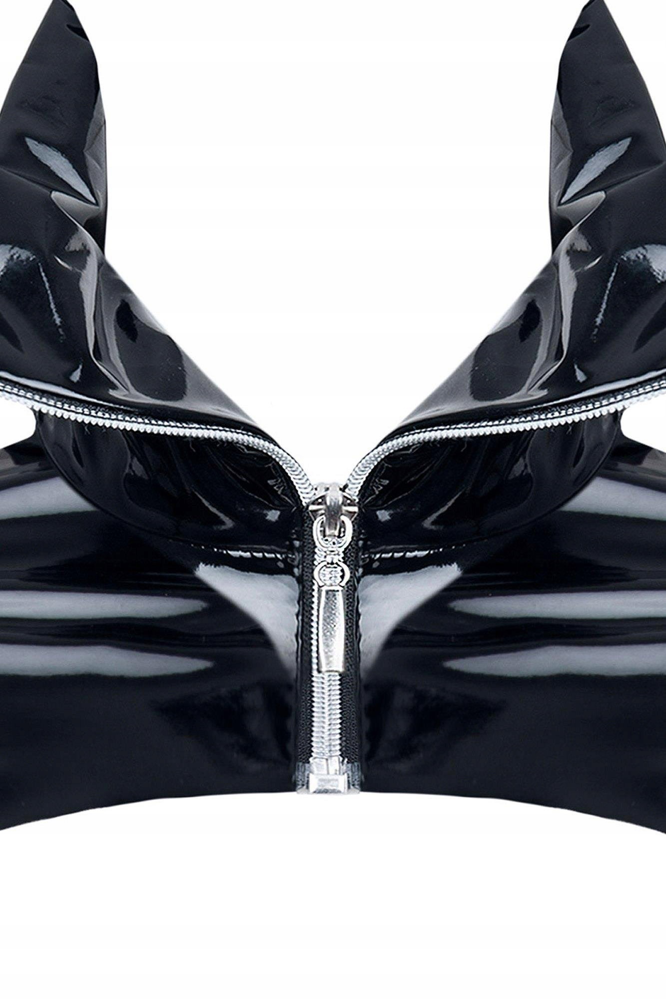 Kurtka wykonana w całości z metalicznie błyszczącego materiału. Dedykowana do pikantnych zabaw i stylizacji z latexowymi maseczkami. Efektownie odkrywa plecy i brzuch, ukazując linię sylwetki. Uwagę przykuwa wysoki kołnierz z ozdobnym srebrnym ekspresem.
