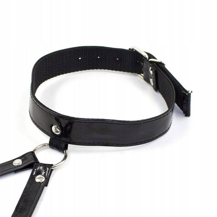 Bielizna dla mężczyzn - Czarny lateksowy komplet. Czarne lateksowe stringi męskie z dziurką oraz uprząż na klatkę piersiową oraz szyję. Komplet wykonany z materiału typu lateks, vinyl, skóra. Zaskocz swoją partnerkę.