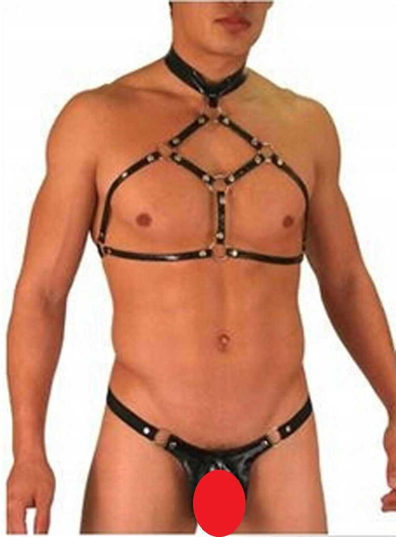 Bielizna dla mężczyzn - Czarny lateksowy komplet. Czarne lateksowe stringi męskie z dziurką oraz uprząż na klatkę piersiową oraz szyję. Komplet wykonany z materiału typu lateks, vinyl, skóra. Zaskocz swoją partnerkę.