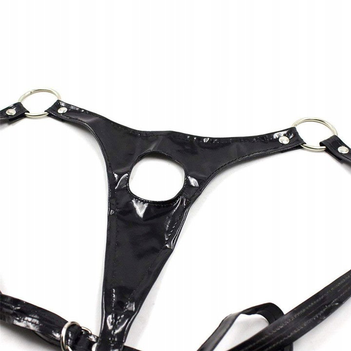 Bielizna Erotyczna dla mężczyzn - Czarny lateksowy komplet. Czarne lateksowe stringi męskie z dziurką oraz uprząż na klatkę piersiową oraz szyję. Komplet wykonany z materiału typu lateks, vinyl, skóra. Zaskocz swoją partnerkę. BDSM !
