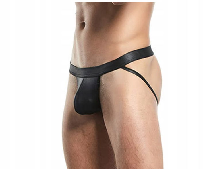 Bielizna dla mężczyzn - czarne majtki męskie. Wykonane z przyjemnego materiału typu vinyl, lateks, skóra.