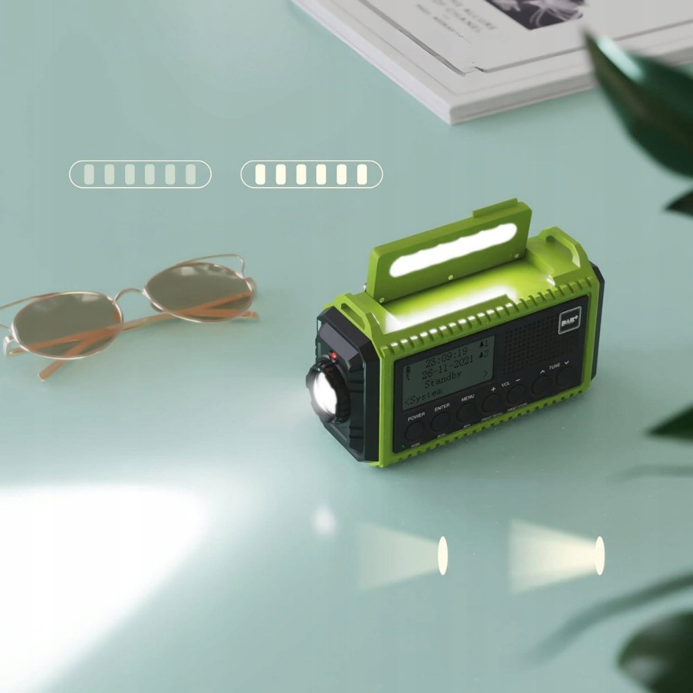 - Zasilanie: USB, panel solarny, korba ręczna, baterie AAA (brak w zestawie), wbudowany akumulator 5000 mAh