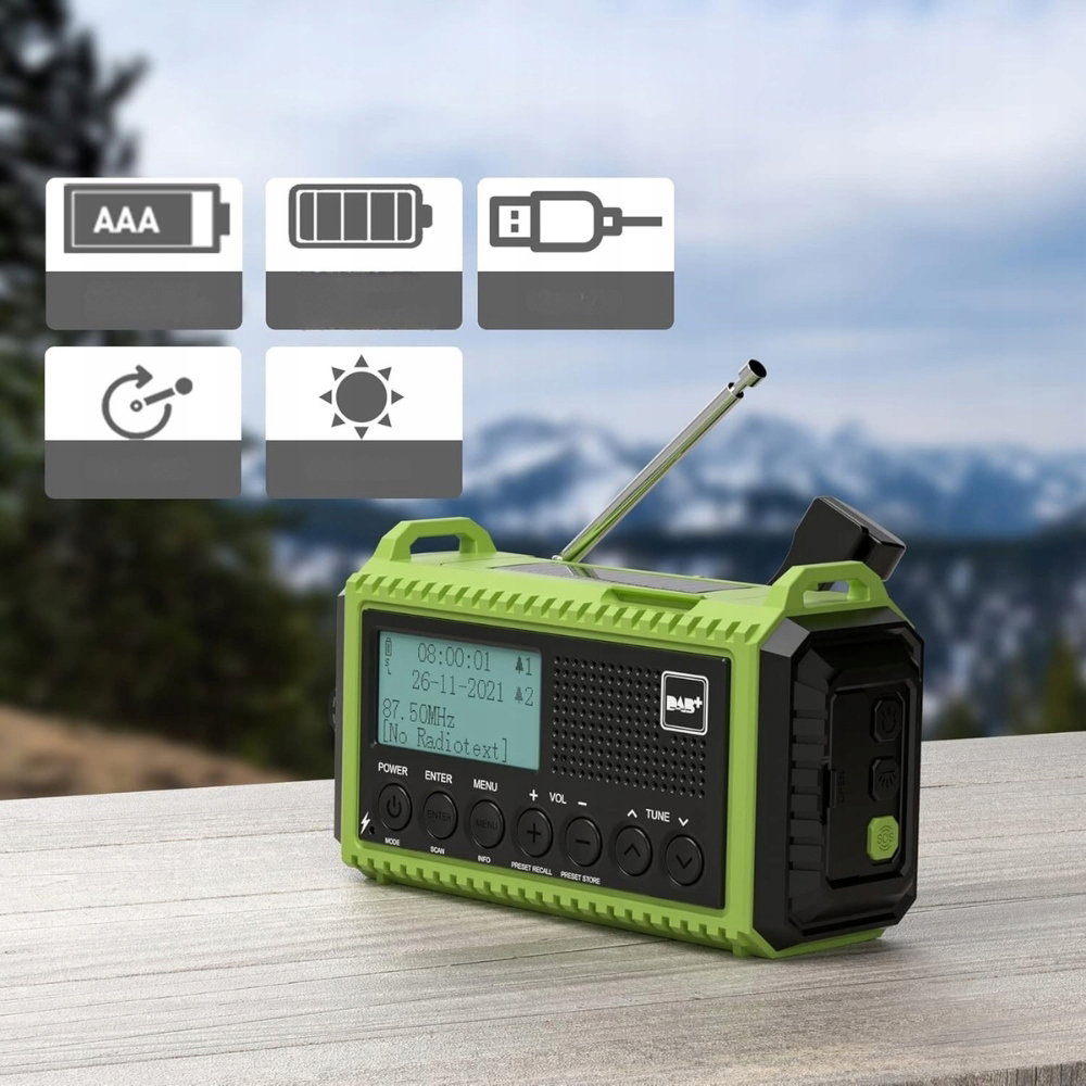 Radio można zasilać kablem USB, panelem słonecznym, korbą ręczną, bateriami AAA lub wbudowanym akumulatorem 5000 mAh, który również pełni funkcję powerbanku do ładowania urządzeń. To niezawodne rozwiązanie podczas biwakowania, wspinaczki czy sytuacji awaryjnych.