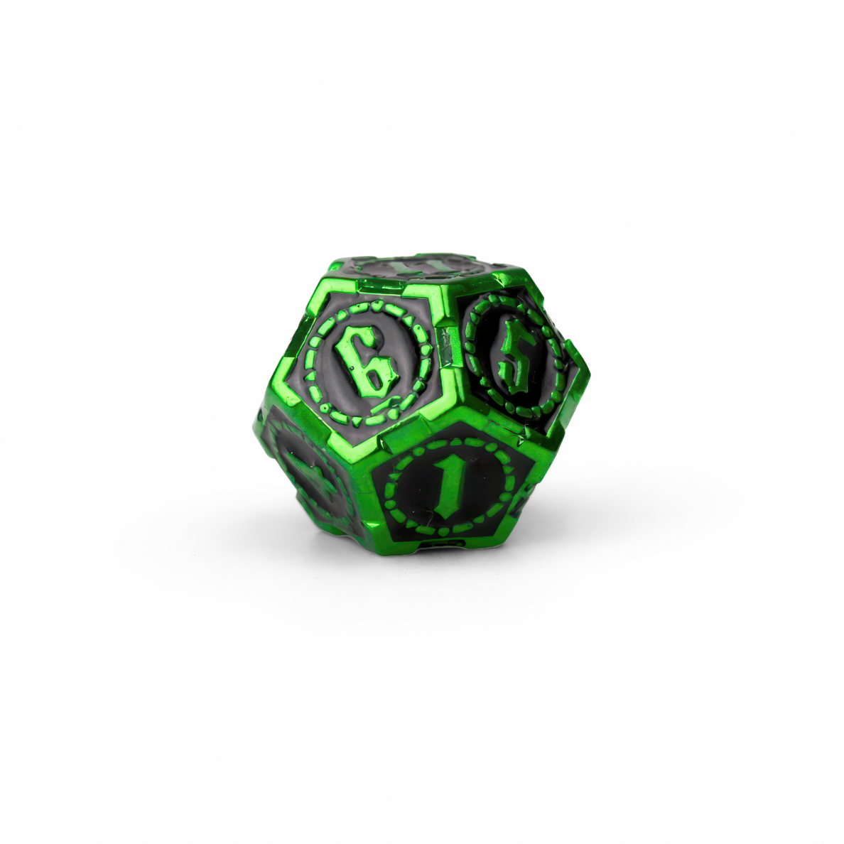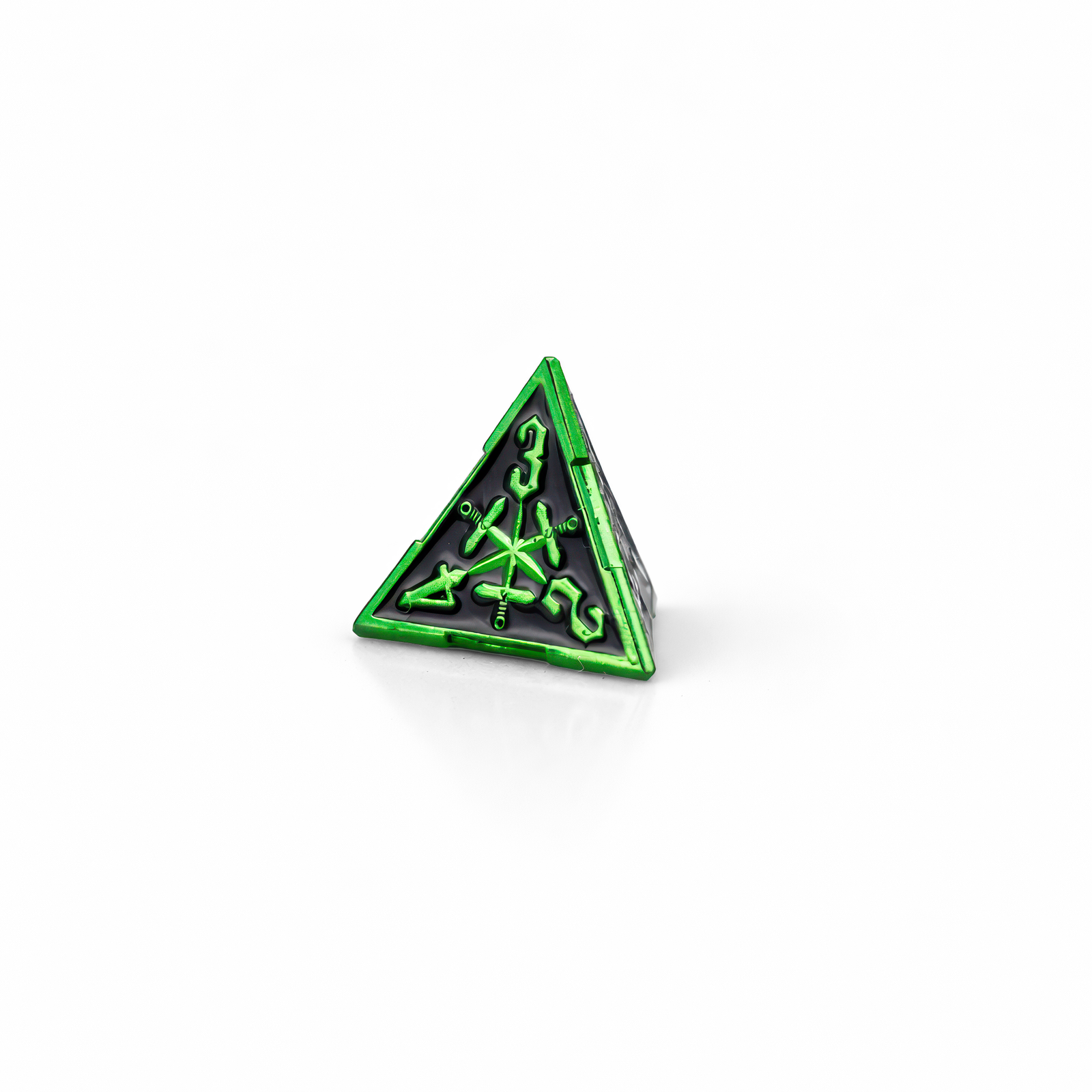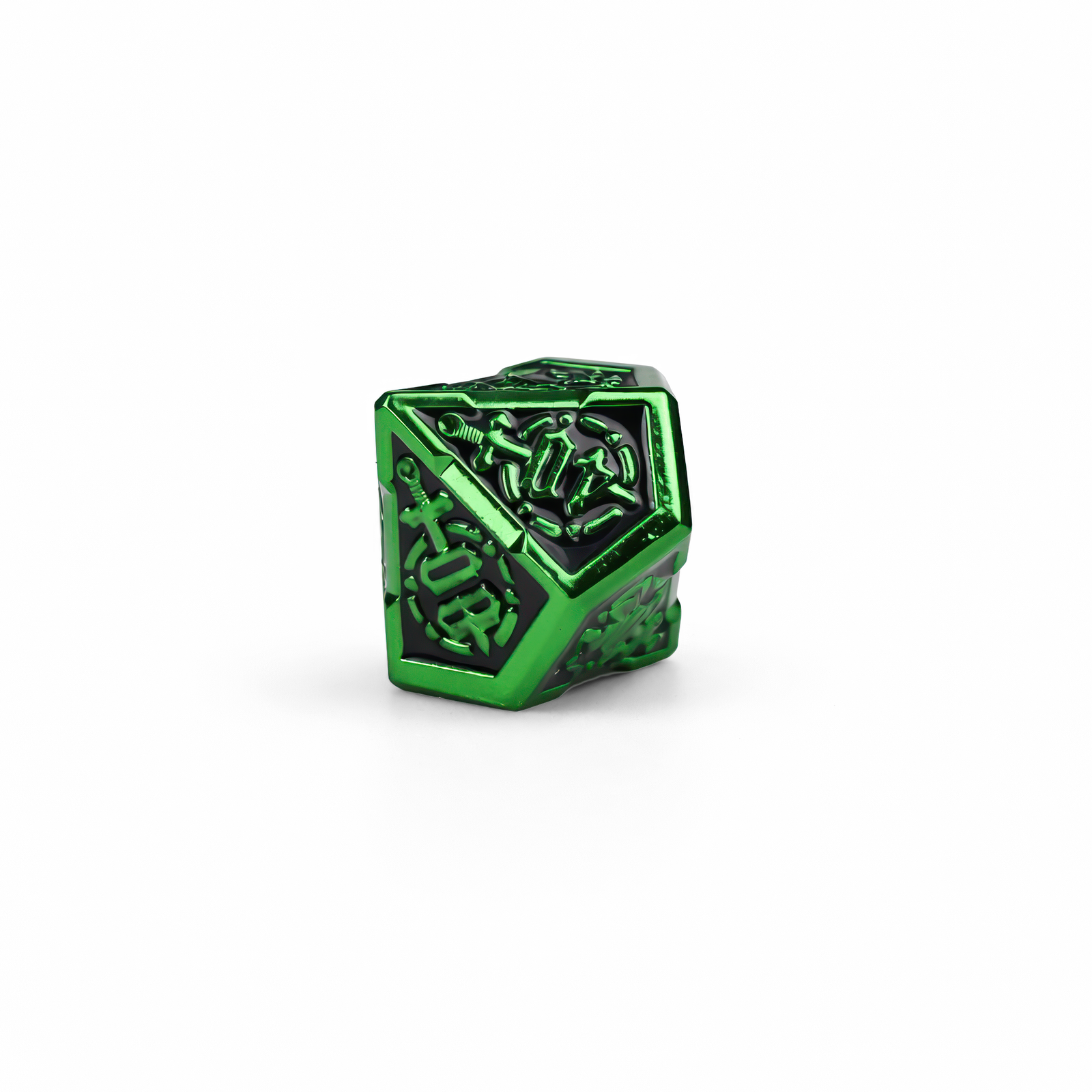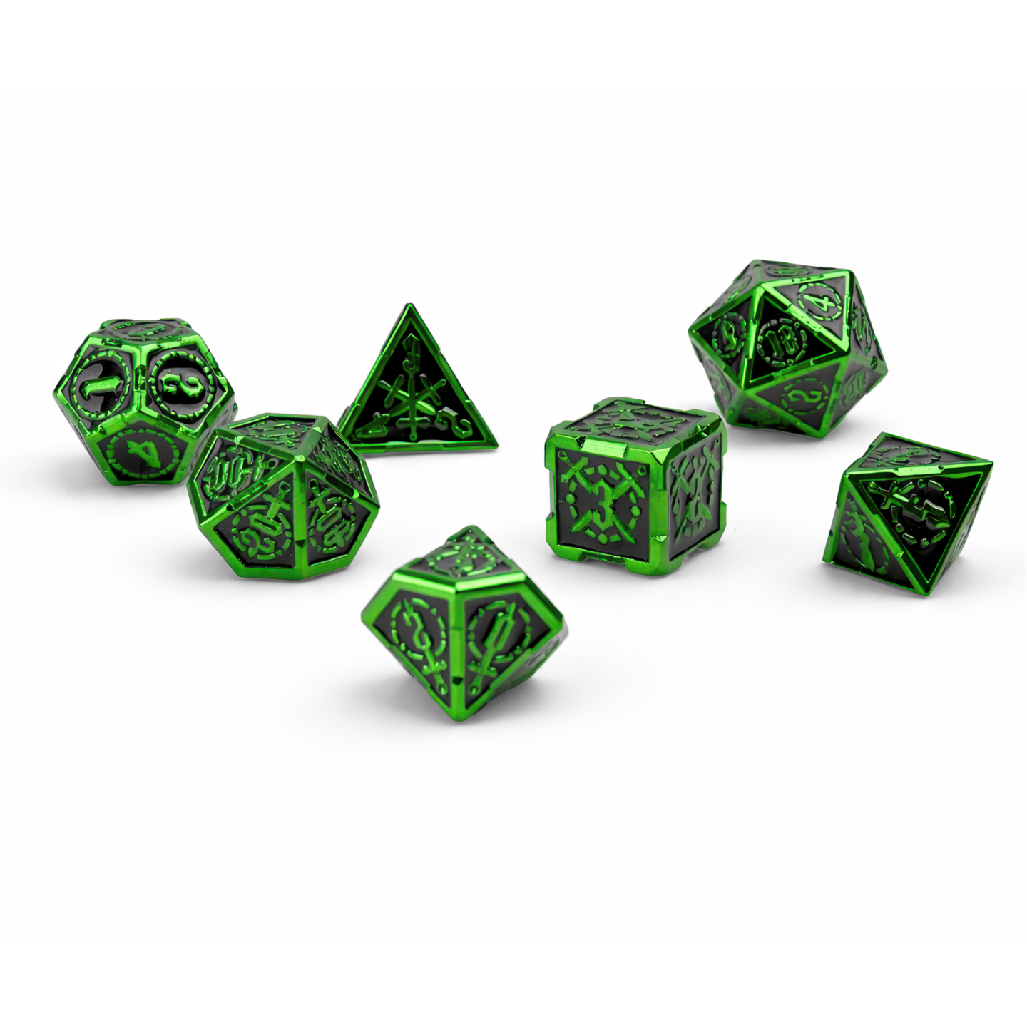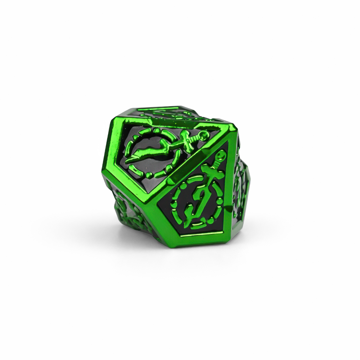 Wyciągnij miecz z kamienia i pozwól, żeby każdy rzut błysnął jak zaczarowana stal — Metallic Lime Green Solid Set wnosi na stół klimat legend arturiańskich i wygląda jak coś godnego królewskiej wyprawy. Jeśli Excalibur zawsze kojarzył Ci się z dumą, magią i wielką przygodą, te kości dorzucą dokładnie tę iskrę do Twojej sesji, półki kolekcjonerskiej albo biurka. Wykonane z metalu i w kompaktowym rozmiarze 3 cm, łączą intensywną, metaliczną limonkową zieleń z głęboką, błyszczącą czernią w zagłębieniach, dzięki czemu wszystko jest czytelne i mocno kontrastowe. Na ściankach widać wyraźne, wypukłe zdobienia: stylizowane cyfry w kropkowanych okręgach oraz motywy mieczy i „runicznych” znaków, które przywołują rycerskie herby i klimat wypraw bez przesady. Fazowane krawędzie pięknie łapią światło, a solidny ciężar daje ten satysfakcjonujący „brzdęk” przy rzucie. Masz pełen zestaw wielościennych kości do większości systemów — postaw je obok figurek, podaruj komuś na prezent i niech zielony blask rozstrzyga losy kolejnej wyprawy, raz po raz.