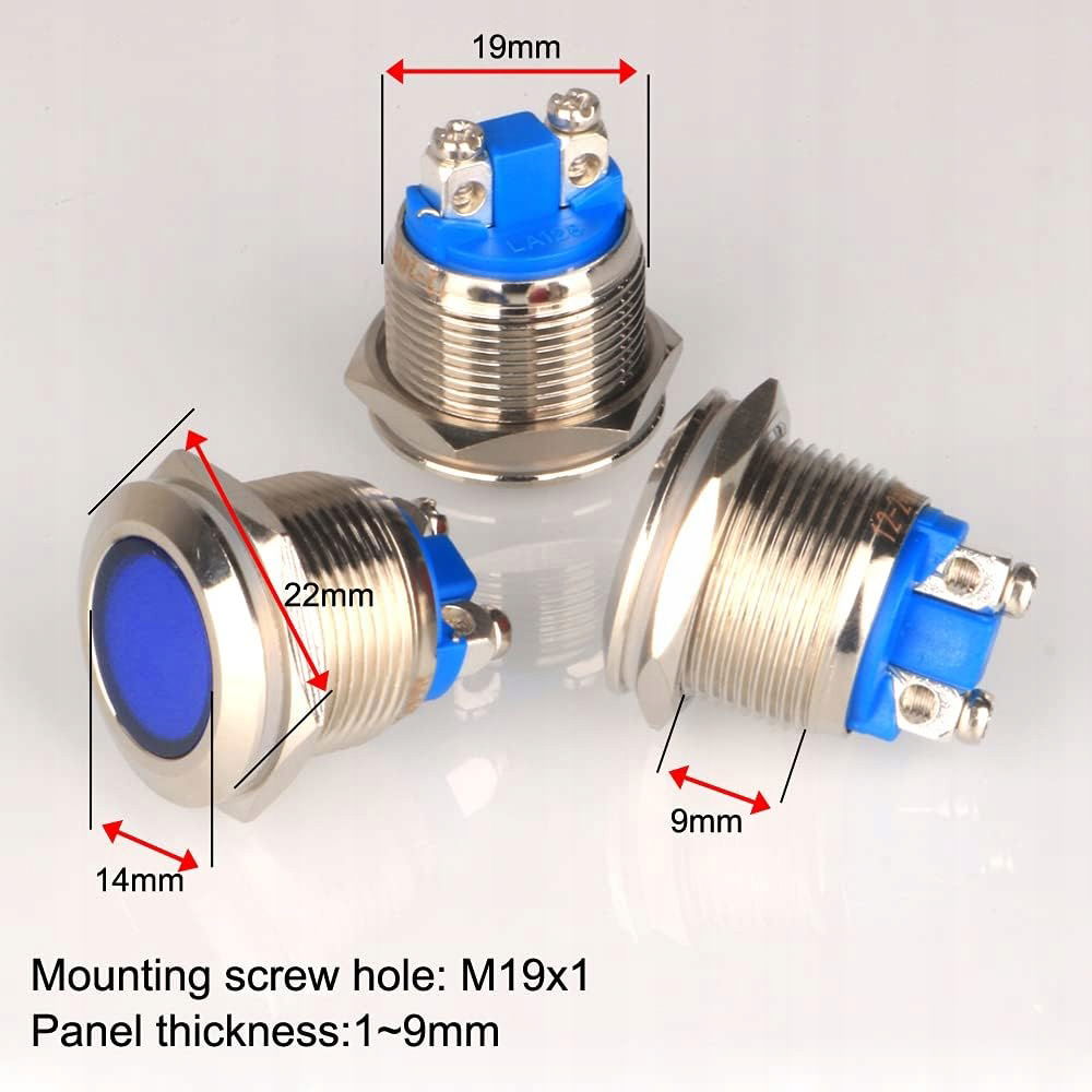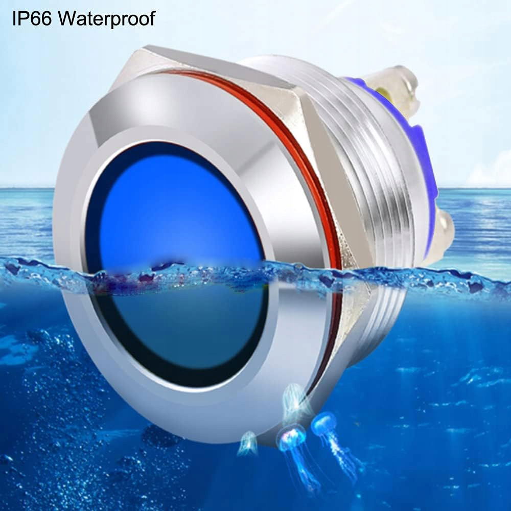 Prąd zmienny/stały 12 V–24 V; Średnica otworu montażowego: 19 mm/0,75 cala; Gwint otworu przycisku: 1mm; Klasa wodoodporności: IP65, żywotność: 10000 godzin.