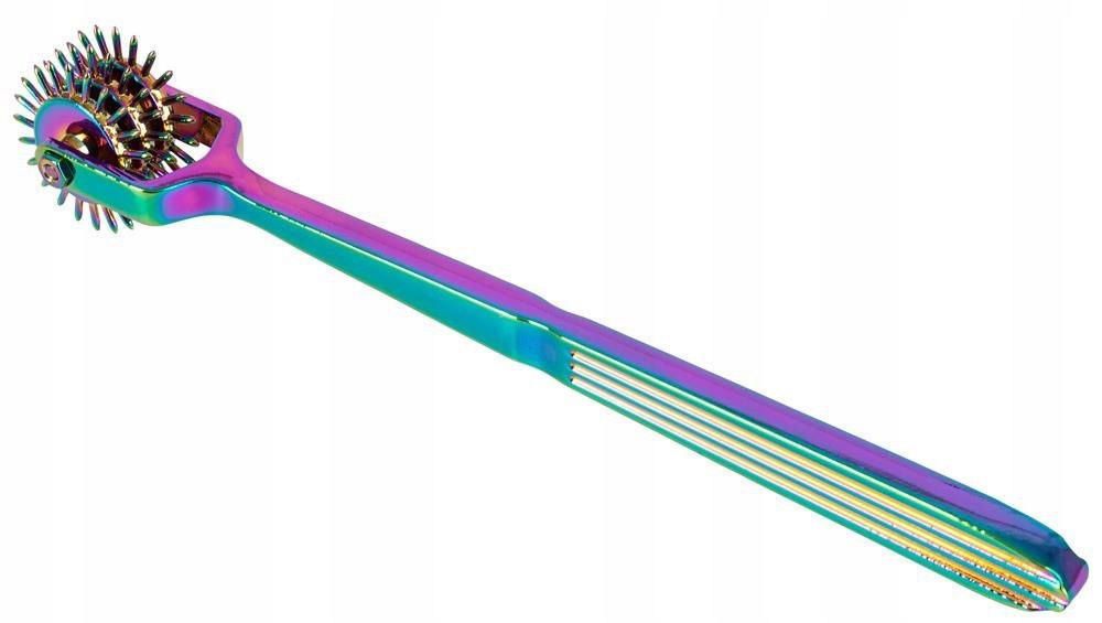 Wytrzymały metalowy wiatraczek Rainbow Triple Pinwheel z kolekcji fetyszowej w mieniących się kolorach tęczy. Jest on przesuwany po skórze z większym lub mniejszym naciskiem, powodując delikatne stymulujące doznania lub intensywny przyjemny ból. Trzy koła z małymi, bardzo ostrymi igłami mogą być używane w dowolnym miejscu na ciele. Długi, wąski uchwyt wygodnie leży w dłoni i zapewnia optymalne prowadzenie oraz zmienny, łatwy do zastosowania nacisk.