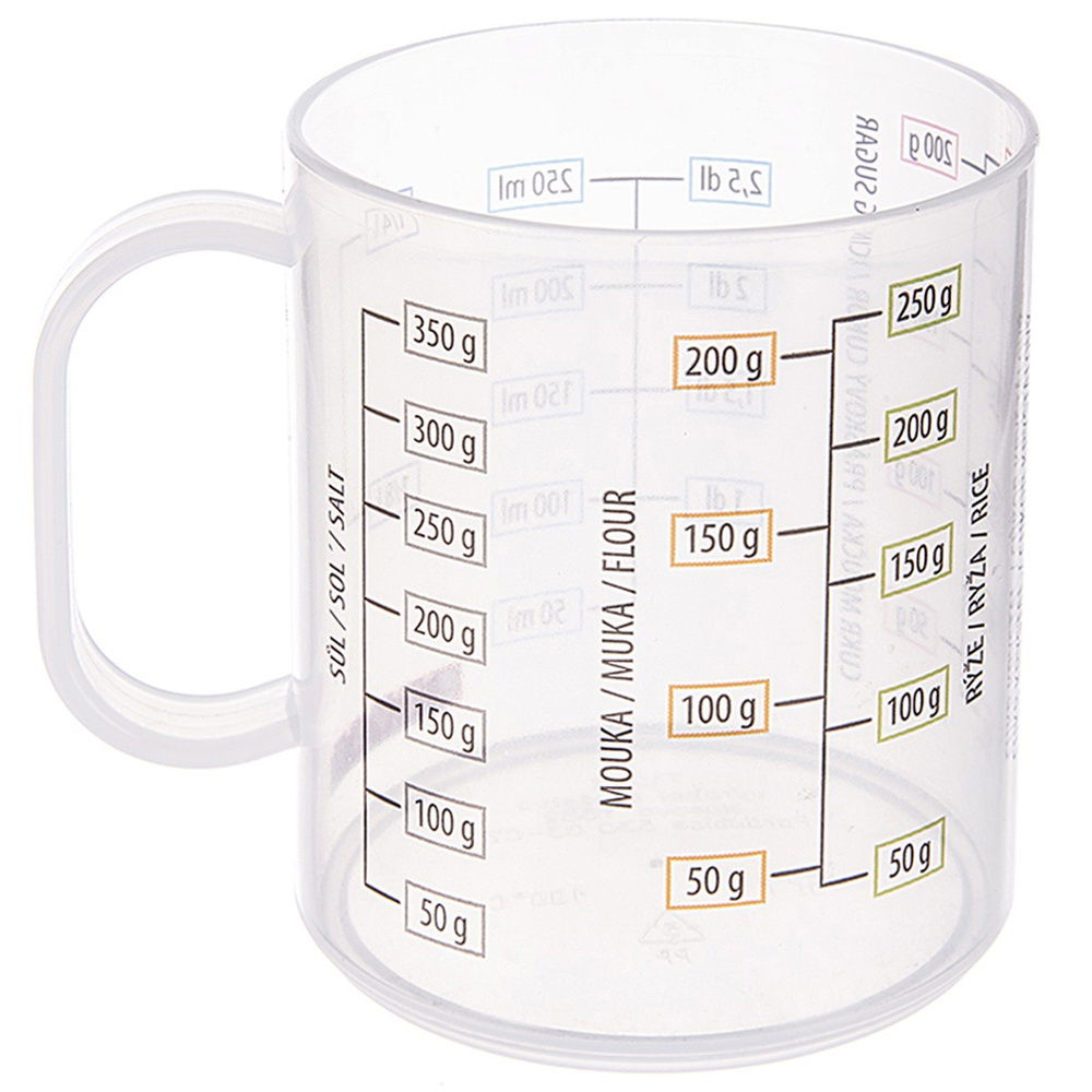 Kubek z miarką ułatwia precyzyjne odmierzanie składników sypkich i płynnych. Dzięki wyraźnej podziałce umożliwia kontrolę ilości dodawanych produktów, co jest szczególnie ważne podczas pieczenia i przygotowywania dań wymagających dokładnych proporcji. Sprawdzi się zarówno w kuchni domowej, jak i w gastronomii, zapewniając wygodę i dokładność podczas gotowania.