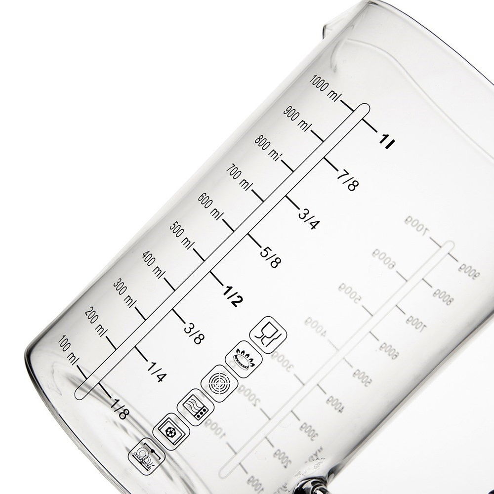 Wykonana ze szkła borokrzemowego - Miarka została wykonana z wytrzymałego borokrzemowego szkła, które jest odporne na zmiany temperatury. Nadaje się do bezpośredniego podgrzewania na niskim stopniu źródła ciepła.