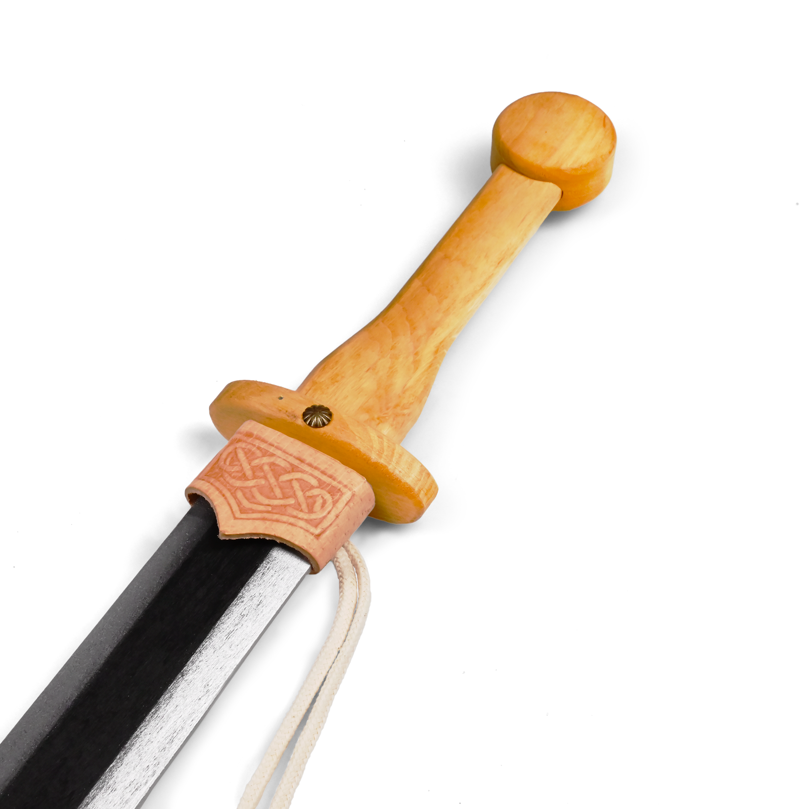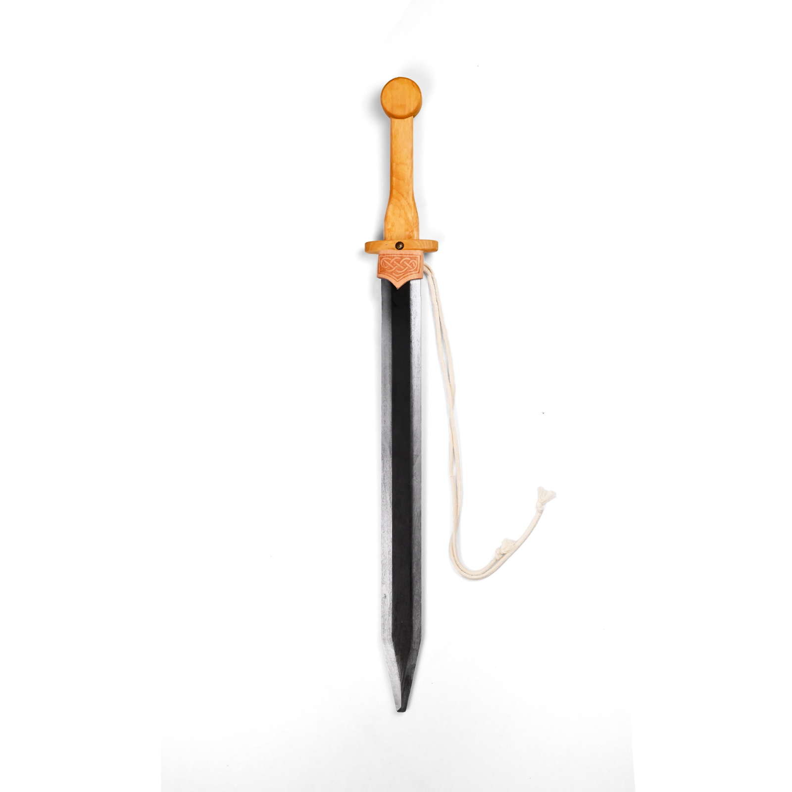 Drewniany Gladius to arcydzieło rzemiosła, charakteryzujące się prostym, mocnym ostrzem, które łączy trwałość z lekkością obsługi. Rękojeść wyrzeźbiona z wysokiej jakości drewna ma bogatą, złotą barwę, która przywodzi na myśl starożytne skarby. Jego klasyczny design uzupełnia prosty, ale elegancki jelec, który nie tylko służy jako wierne odwzorowanie historyczne, ale także zapewnia pewny chwyt aspirującym gladiatorom.
