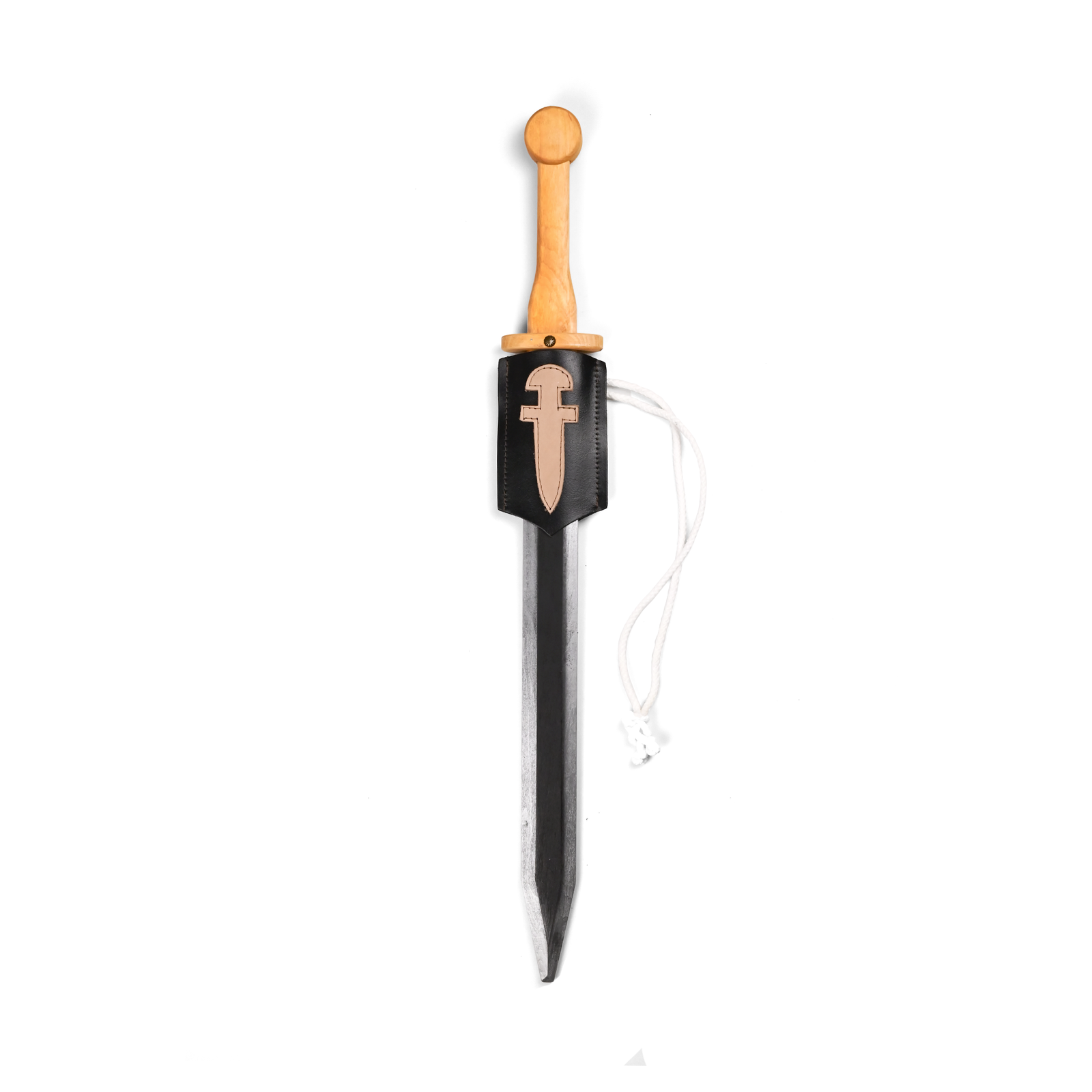 Drewniany Gladius to arcydzieło rzemiosła, charakteryzujące się prostym, mocnym ostrzem, które łączy trwałość z lekkością obsługi. Rękojeść wyrzeźbiona z wysokiej jakości drewna ma bogatą, złotą barwę, która przywodzi na myśl starożytne skarby. Jego klasyczny design uzupełnia prosty, ale elegancki jelec, który nie tylko służy jako wierne odwzorowanie historyczne, ale także zapewnia pewny chwyt aspirującym gladiatorom.