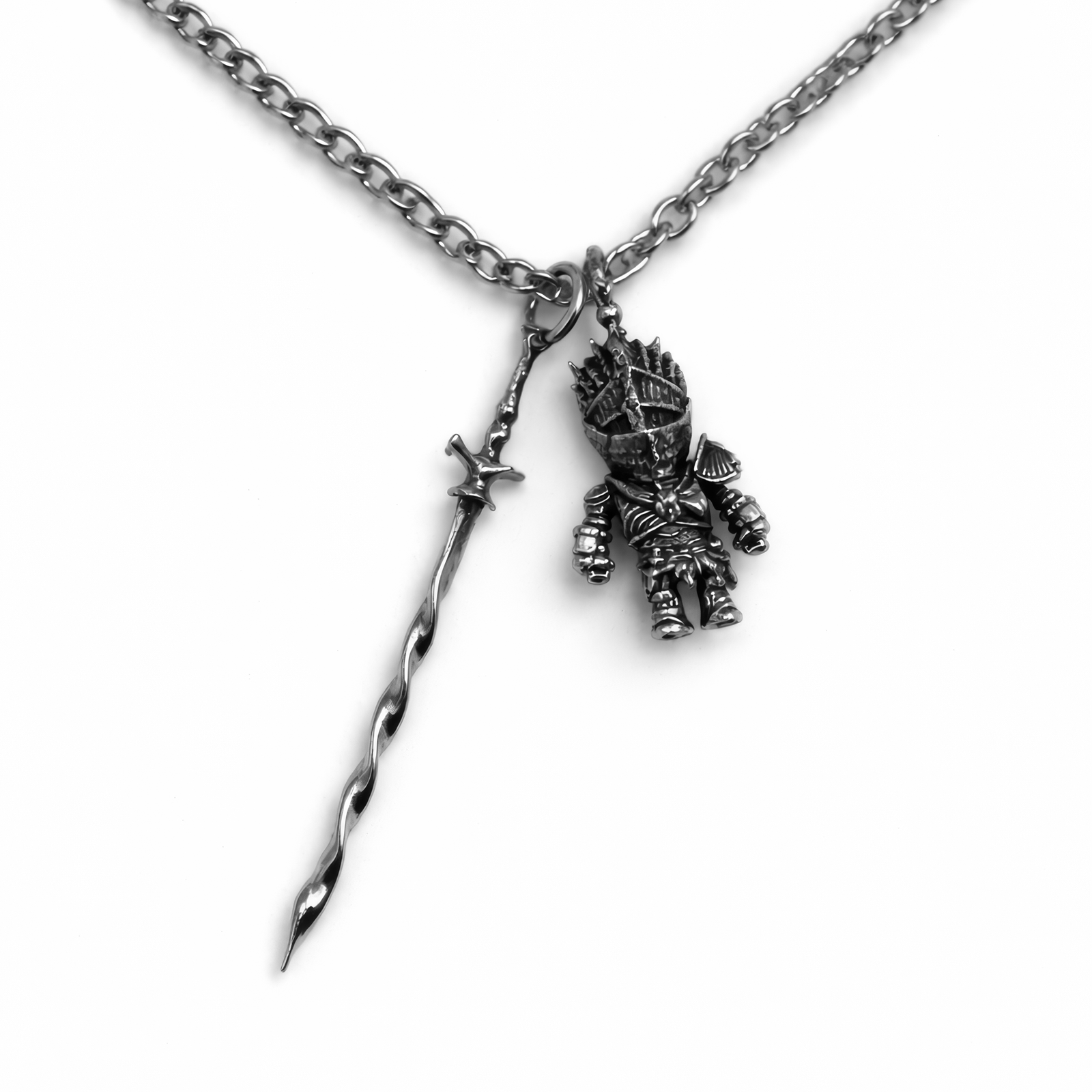 Noś fragment Krainy Między z tą starannie wykonaną zawieszką o wymiarach 4 cm. Odlana ręcznie z wytrzymałego metalu w efektownym monochromatycznym wykończeniu, oddaje ikonicznego ducha upadłych rycerzy z Elden Ring. Każda płyta, każdy nit na zbroi został z miłością odwzorowany w niesamowicie małej skali, ukazując charakterystyczną średniowieczno-fantasy estetykę gry. Rycerz stoi niezłomnie, dzierżąc długi, smukły miecz z teksturowanym ostrzem, które zdradza jego kowalskie pochodzenie. Subtelny, przyciemniony odcień metalu dodaje głębi skomplikowanym detalom zbroi, jednocześnie przywołując ponure opowieści o wojownikach zagubionych w świecie. Zawieszona na klasycznym łańcuszku, ta kompaktowa, a jednocześnie zadziwiająco szczegółowa ozdoba staje się potężnym symbolem epickiej walki i trwałego dziedzictwa gry – kieszonkowym hołdem dla rycerzy, którzy stoją między Ruiną a wiecznym zmierzchem. Idealna dla fanów, którzy cenią głębię i atmosferę arcydzieła FromSoftware.