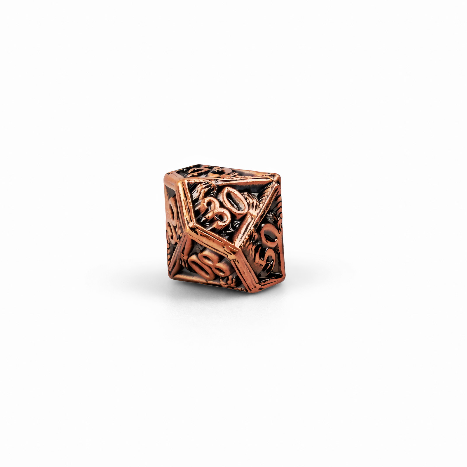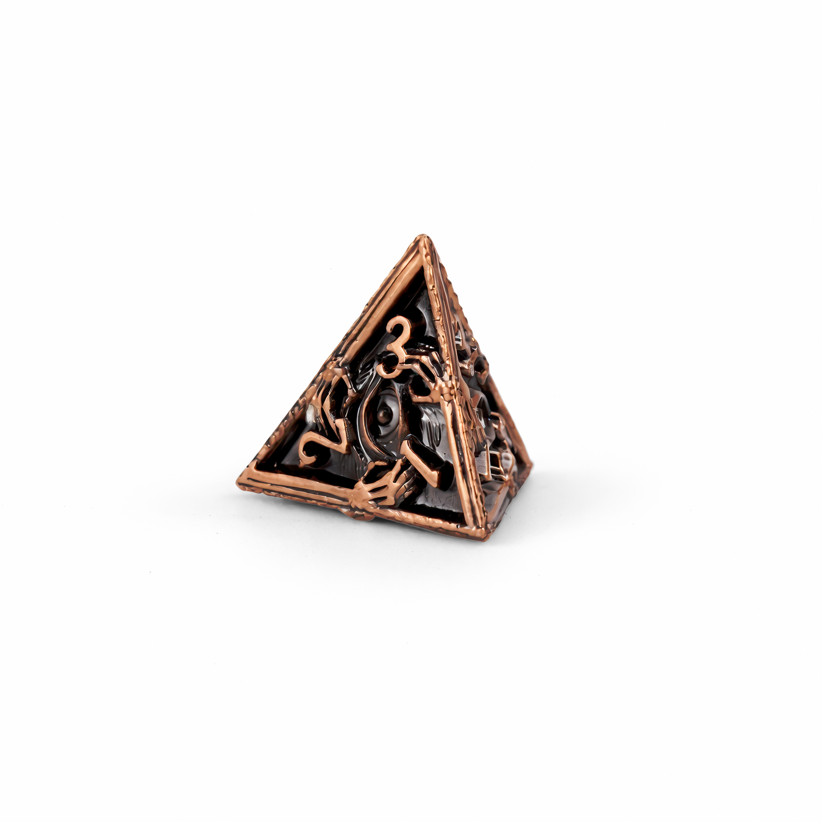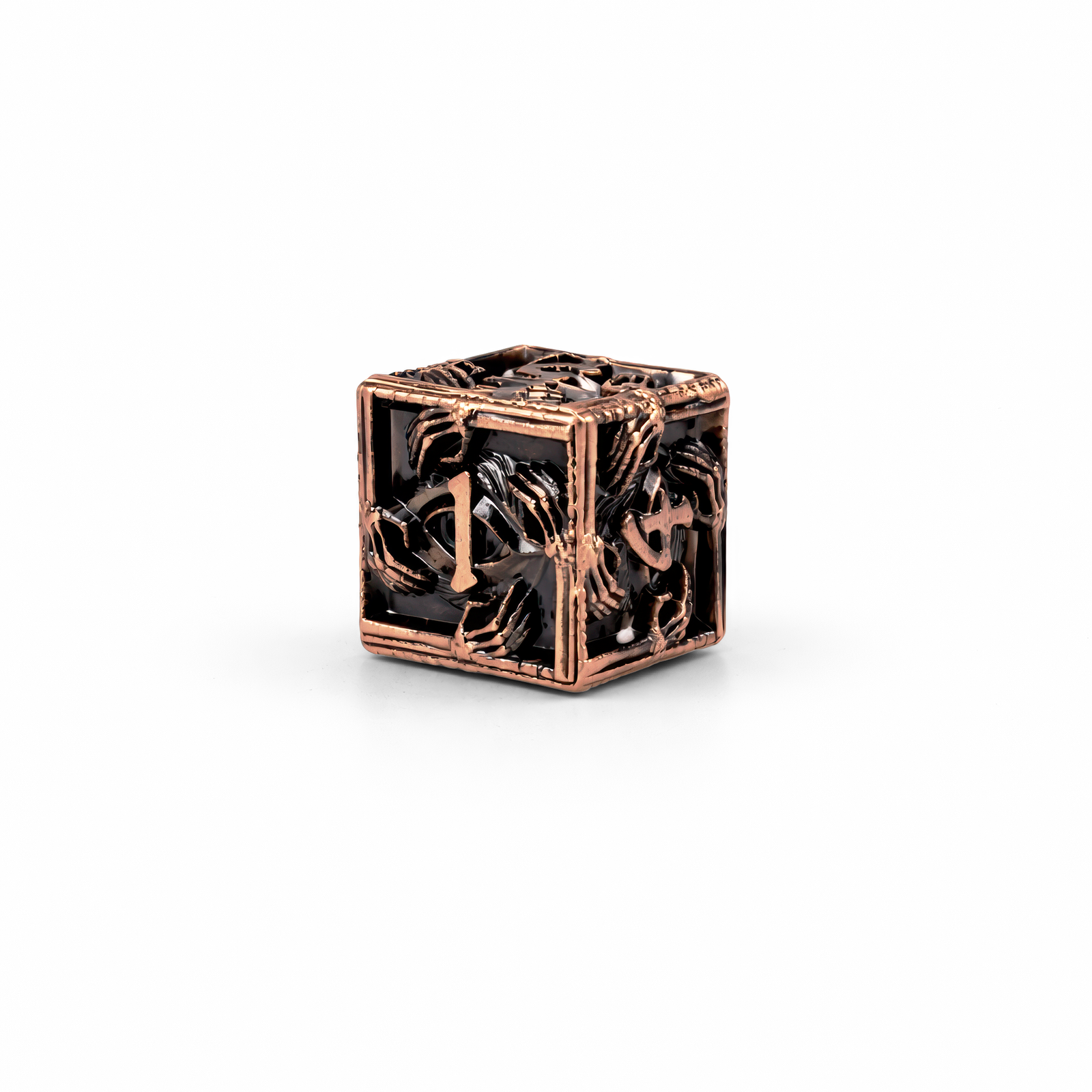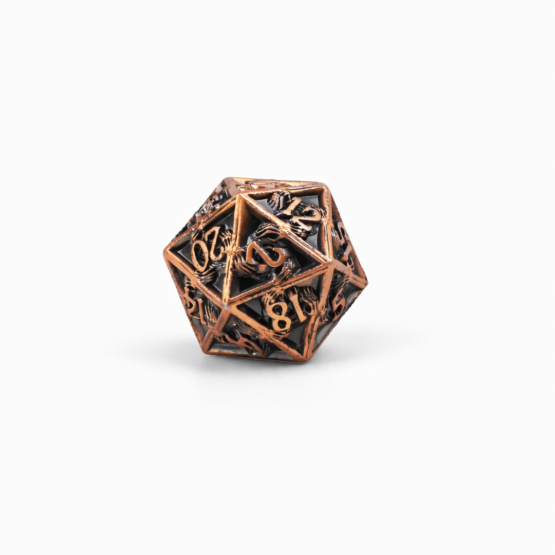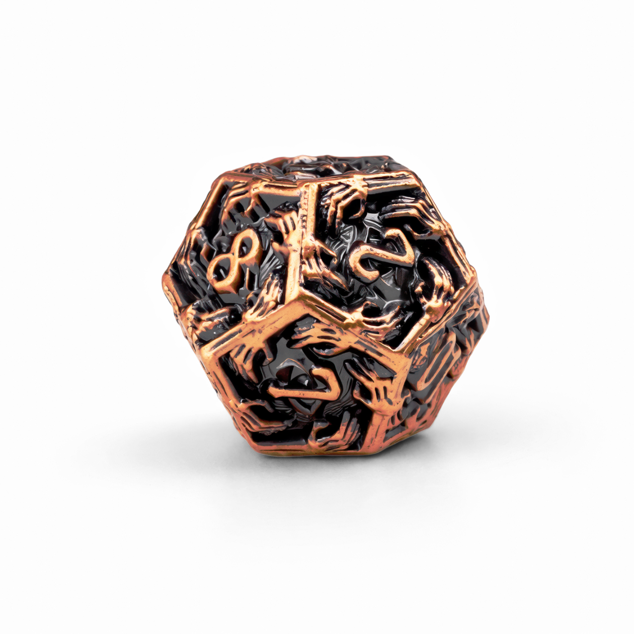 Od pierwszego brzęku w dłoni Necro Hands wygląda jak łup wyciągnięty z zapieczętowanej krypty — idealny, żeby każdy rzut miał swój klimat. Ten Set to solidny zestaw metalowych kości 3 cm, z błyszczącym, czarnym wnętrzem i ciepłą, miedzianą ramą, jakby cyfry były skute w klatce z kościstych, wyciągniętych rąk. Na ściankach widać rzeźbione dłonie i żebrowane faktury oplatające wypukłe numerki, a fazowane krawędzie łapią światło matowo–połyskującą, “antyczną” miedzią. Głębokie czarne zagłębienia robią mocny kontrast, a pełna konstrukcja dodaje tej rzeźbie warstw i cieni.
