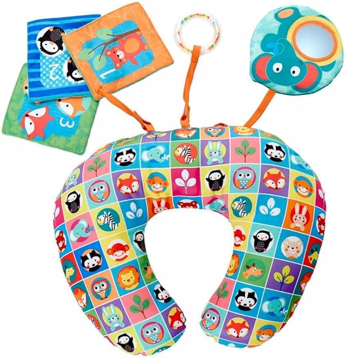 Poduszka została wyposażona w różnorodne zabawki, które wspierają rozwój sensoryczny dziecka.