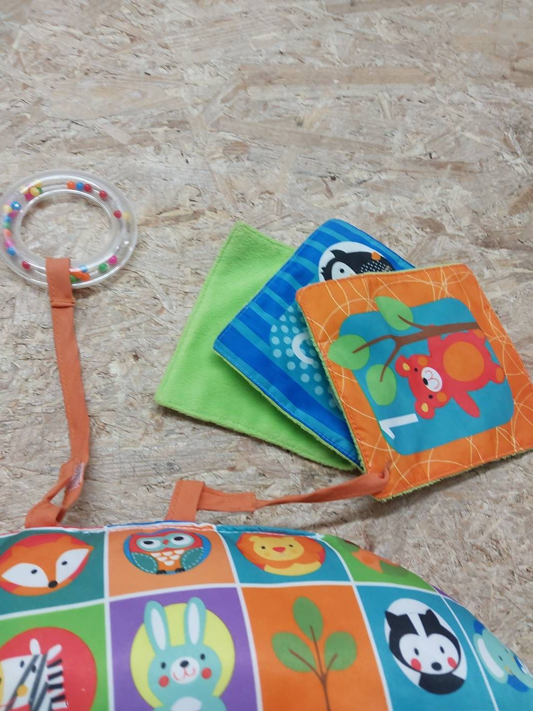 Miękka książeczka z kolorowymi kartami oraz szeleszczącymi elementami przyciąga uwagę i stymuluje zmysł wzroku oraz słuchu.