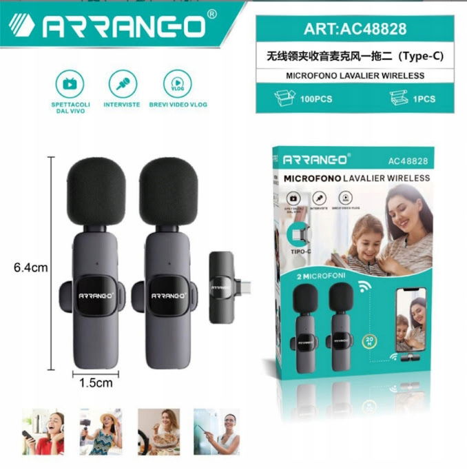 Arrango AC48828 Bezprzewodowy mikrofon krawatowy, bezprzewodowy mikrofon typu plug-play z 2 mikrofonami do nagrywania wideo, wywiadów, vlogów, automatycznej synchronizacji i redukcji szumów przez USB-C z telefonem z systemem Android