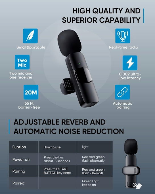 【Transmisja na duże odległości i długi czas pracy na baterii】: Ulepszona technologia bezprzewodowej transmisji mikrofonu zapewnia stabilną transmisję sygnału audio na odległość do 19,8 m (65 stóp) bez kabli i zakłóceń. Odbiornik jest zasilany z urządzenia (można go jednocześnie ładować), a wbudowane akumulatory nadajnika wystarczają na 4-6 godzin pracy.