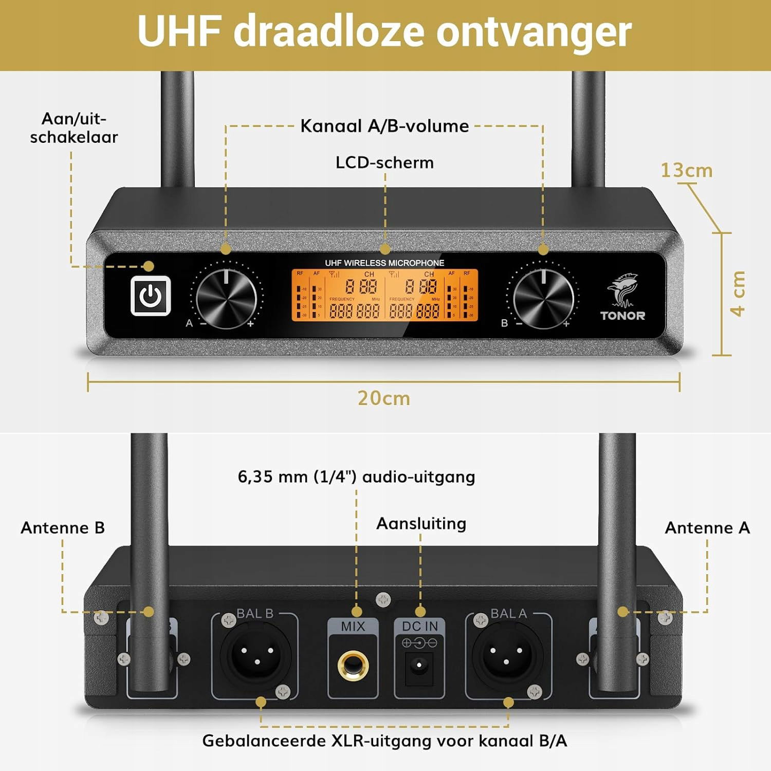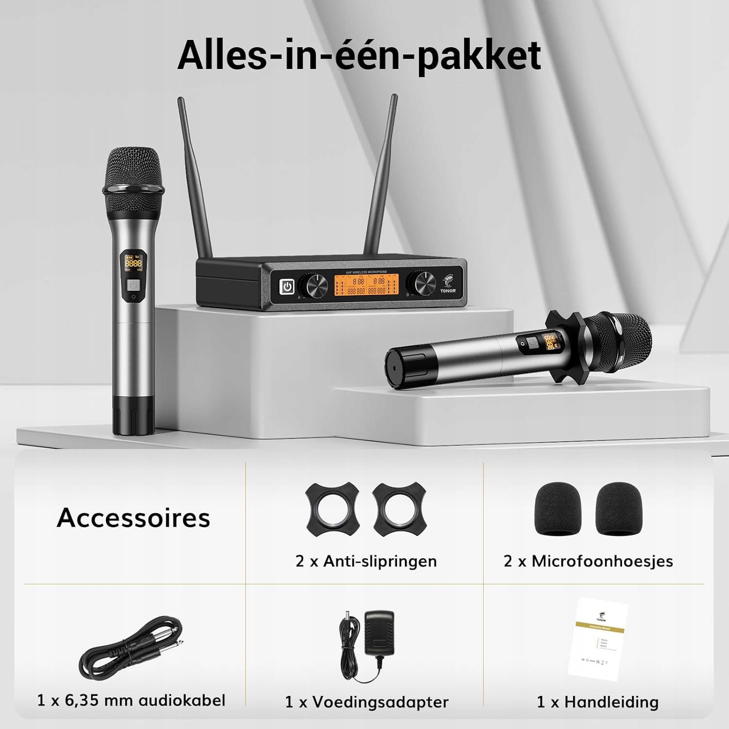 TONOR bezprzewodowy mikrofon UHF, profesjonalny, dynamiczny, podwójny mikrofon, ręczny system mikrofonowy, zestaw KTV, do karaoke, na imprezę, dla DJ, do kościoła, na wesele, 60 m, TW820, Szary