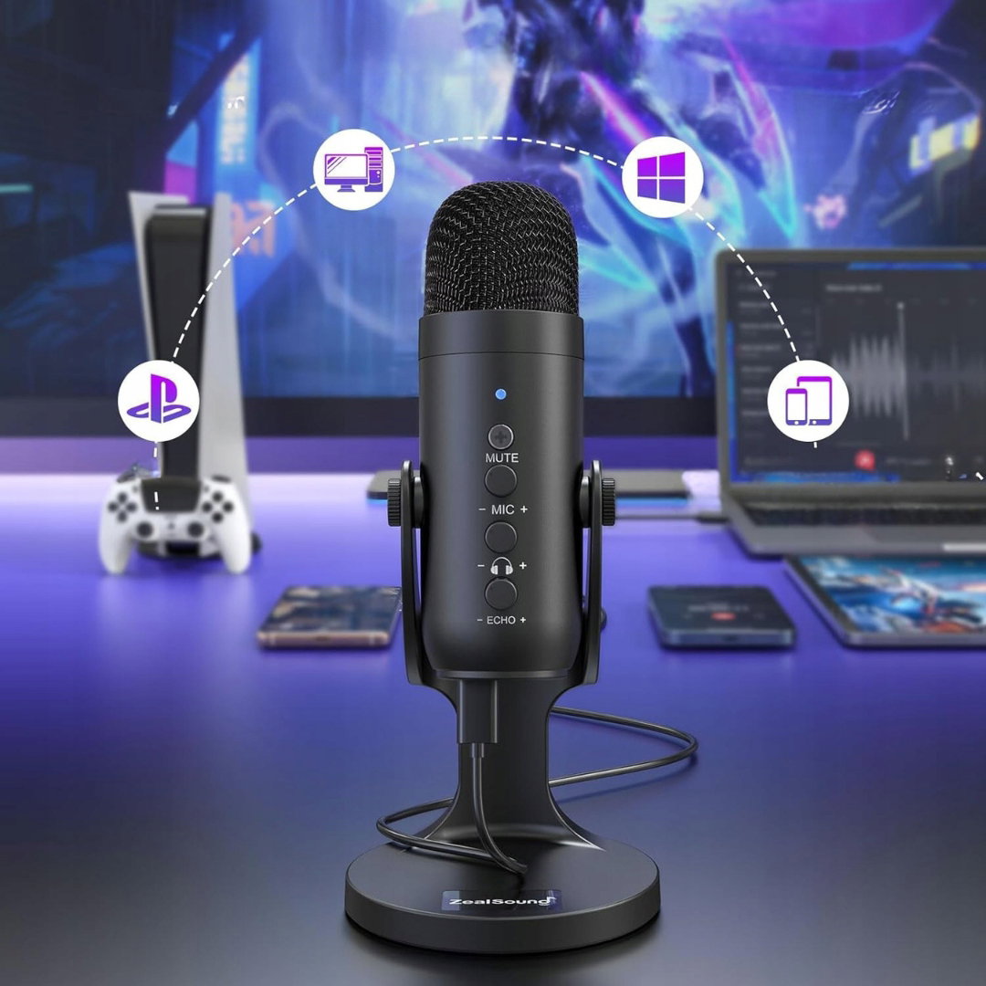 zealsound Mikrofon USB, mikrofon pojemnościowy do telefonu komórkowego, PS4, PS5, do gier, podcastów, nagrywania, streamingu, ASMR z wyciszeniem/wzmocnieniem/echo, adapter do telefonu.