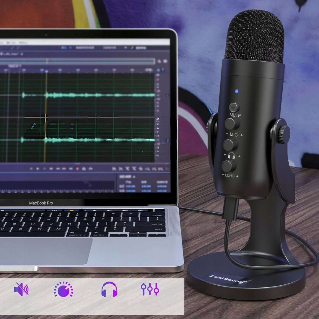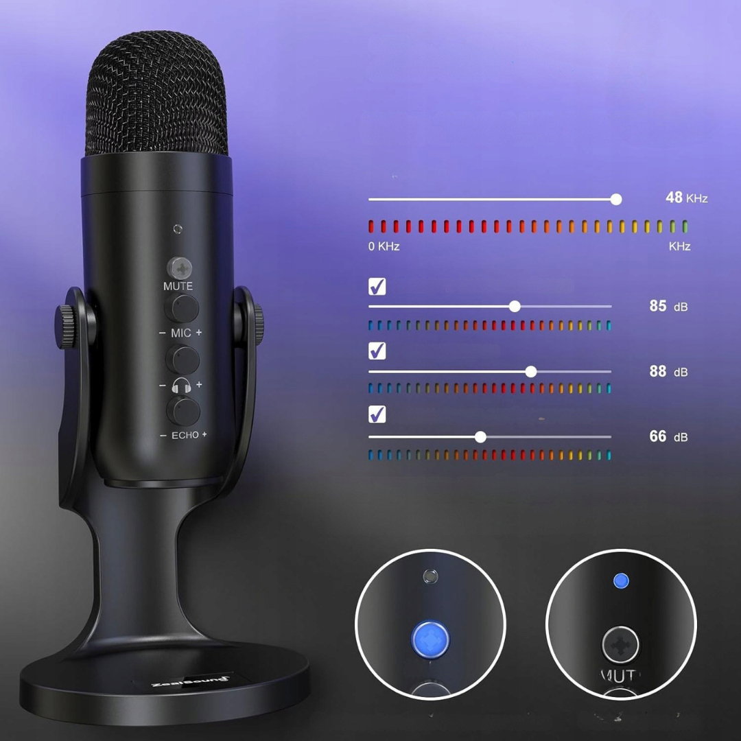 zealsound Mikrofon USB, mikrofon pojemnościowy do telefonu komórkowego, PS4, PS5, do gier, podcastów, nagrywania, streamingu, ASMR z wyciszeniem/wzmocnieniem/echo, adapter do telefonu.