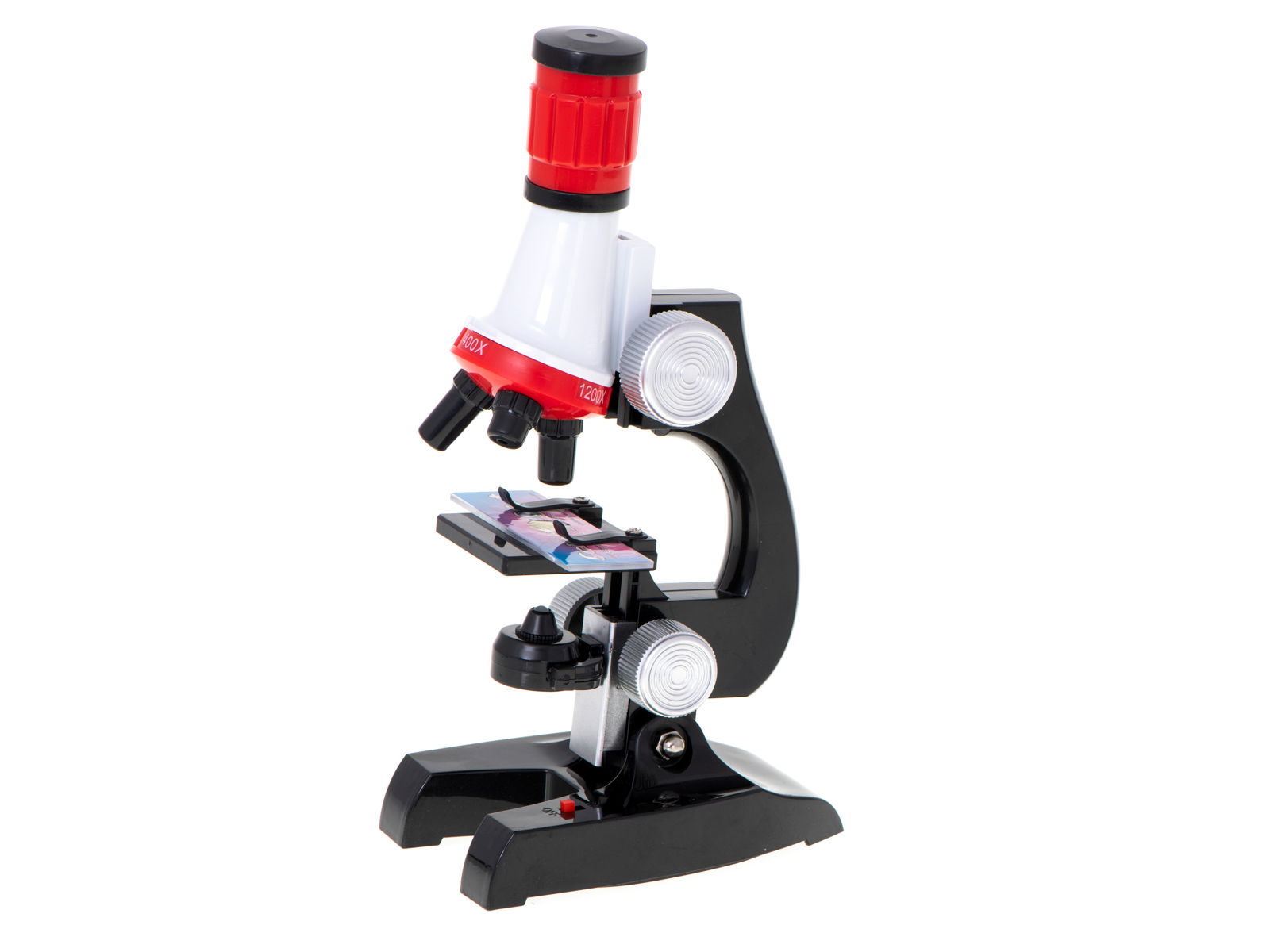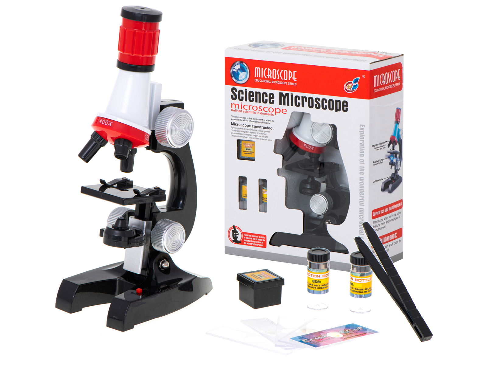 Urządzenie oferuje trzy poziomy powiększenia: 100x, 400x i 1200x, a wbudowana żarówka zapewnia odpowiednie podświetlenie preparatów, ułatwiając obserwacje.