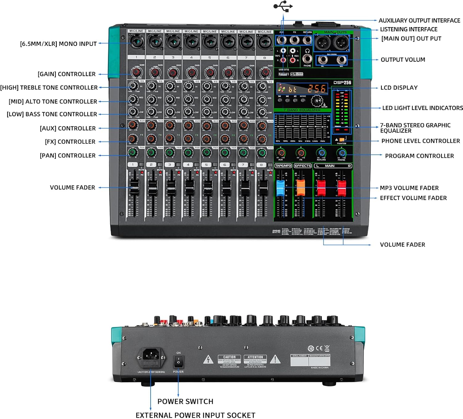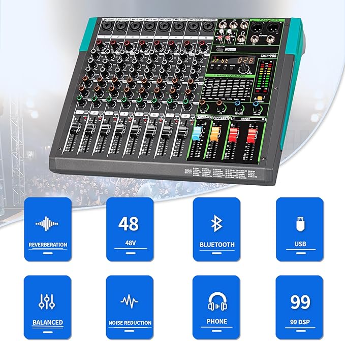 Depusheng PA8 Profesjonalny mikser audio Płyta dźwiękowa Konsola Interfejs systemu biurkowego 8-kanałowy cyfrowy USB Bluetooth MP3 Wejście komputerowe 48 V Zasilanie fantomowe Wbudowany efekt pogłosu 256,