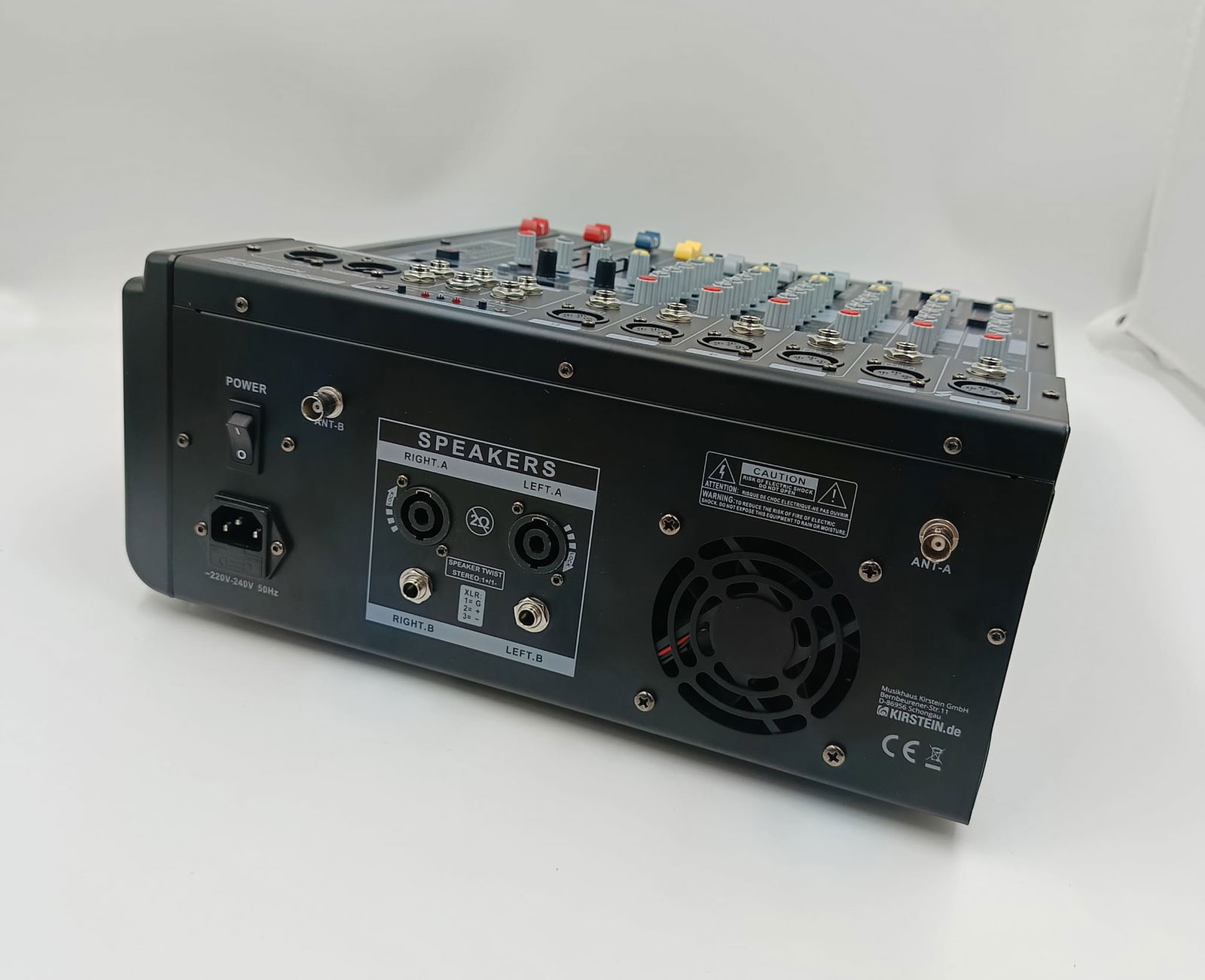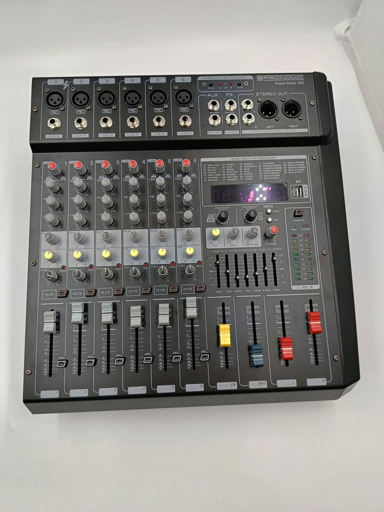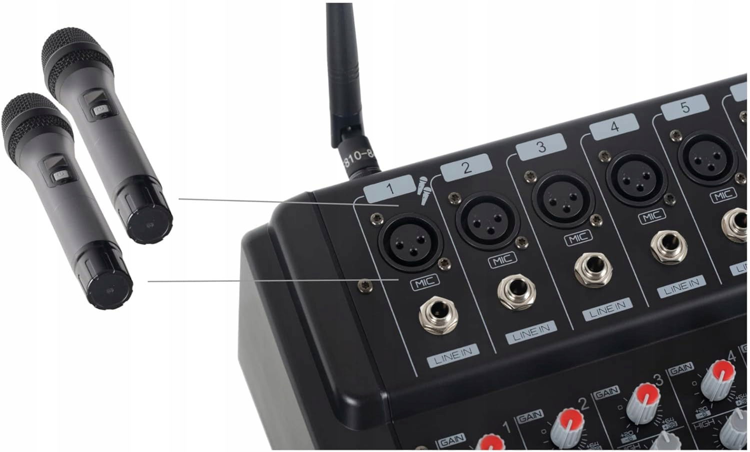 - PA POWERMIXER Z 6 KANAŁAMI - Wejście mikrofonowe w formacie XLR, symetryczne wejście liniowe (gniazdo 6,3 mm), regulacja wzmocnienia, 3-pasmowy korektor (± 15 dB), sterowanie AUX, sterowanie FX, regulacja panoramy, przycisk wyciszenia, przycisk PFL, suwak głośności (60 mm)