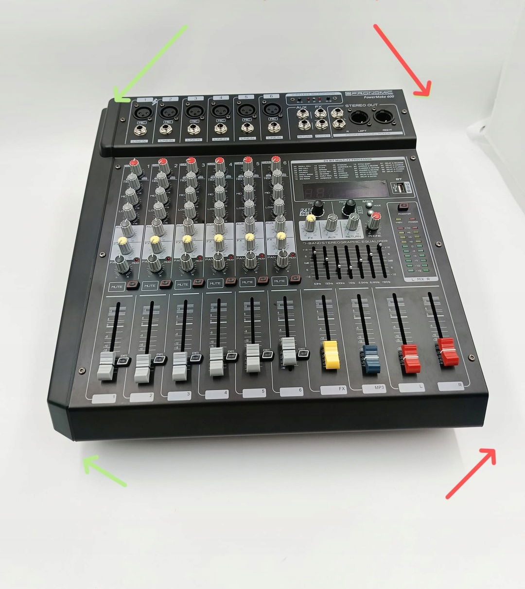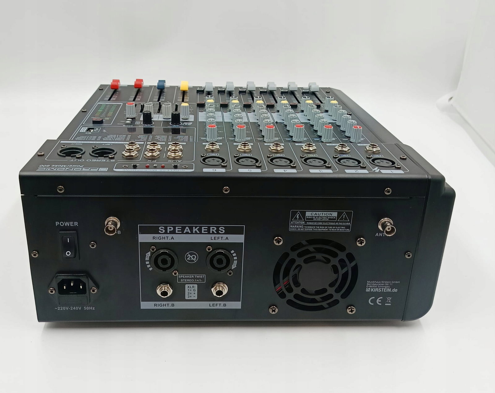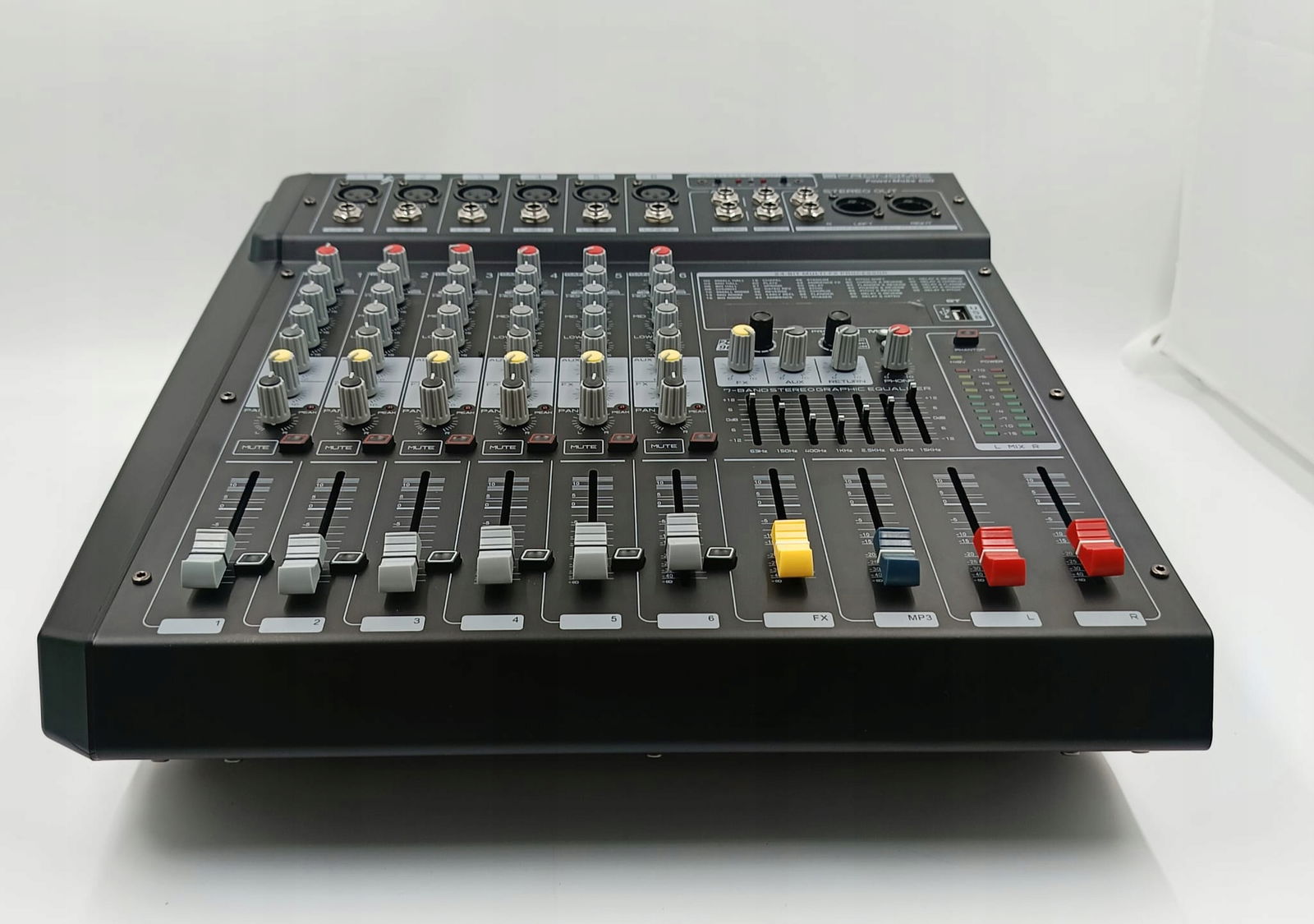 - PA POWERMIXER Z 6 KANAŁAMI - Wejście mikrofonowe w formacie XLR, symetryczne wejście liniowe (gniazdo 6,3 mm), regulacja wzmocnienia, 3-pasmowy korektor (± 15 dB), sterowanie AUX, sterowanie FX, regulacja panoramy, przycisk wyciszenia, przycisk PFL, suwak głośności (60 mm)