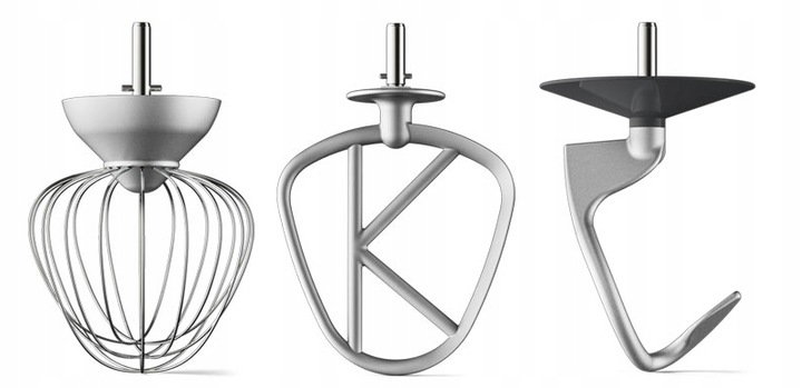 - mieszadło K – jego designerski kształt to sekret doskonałych efektów mieszania. Umożliwi przygotowanie ciast np. biszkoptowego, piaskowego lub makaronowego, ciasteczek, cukierków, różnego rodzaju nadzień i farszów, puree oraz wielu innych dań.