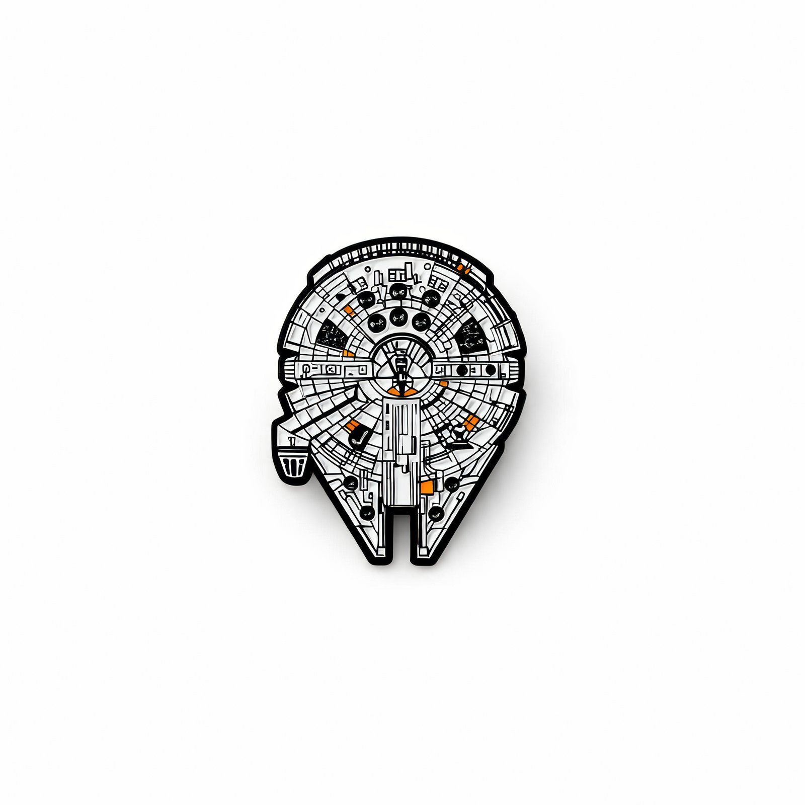 Świętuj kultowy wygląd Sokoła Millenium dzięki tej starannie wykonanej metalowej przypince o wymiarach 4 cm. Widok czołowy sylwetki legendarnego frachtowca z Corellii przedstawiony jest w szczegółowym, graficznym stylu, oddającym charakterystyczny kokpit i sfatygowaną powłokę. Elegancka monochromatyczna paleta szarości i srebra nadaje całości wyrafinowany wygląd, a subtelne akcenty pomarańczowe i żółte nawiązują do świateł i wewnętrznych mechanizmów statku. Każdy panel, otwór wentylacyjny i detal powłoki są wypukłe lub wytłoczone, aby stworzyć głębię, dzięki czemu „żywy” wygląd Sokoła wyróżnia się na każdej powierzchni. Wytrzymałe czarne wykończenie z dwoma bezpiecznymi zapięciami zapewnia solidne przymocowanie do kurtek, plecaków lub stojaków ekspozycyjnych. Niezależnie od tego, czy jesteś kolekcjonerem, czy fanem pragnącym pokazać swoją miłość do najsłynniejszego statku w galaktyce, ta przypinka oferuje stylowy i subtelny sposób na przenoszenie ducha przygody i rebelii, gdziekolwiek się udasz.