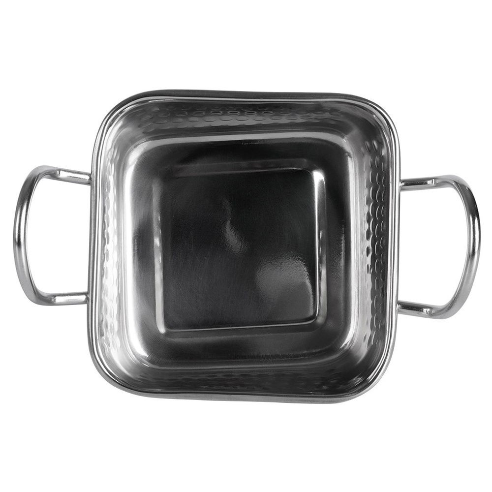 Stalowe naczynie do serwowania potraw w kształcie mini brytfanny. Sprawdzi się do efektownego podawania frytek, pieczonych ziemniaków, warzyw i wielu innych dań czy przekąsek. Nadaje się do zarówno ciepłych, jak i zimnych dań. Solidnie wykonane w modnym, srebrnym kolorze. Taka forma podania potraw jest bardzo efektowna. Mini brytfanka ma uniwersalny wygląd, pasuje do wielu okazji. Sprawdzi się do użytku domowego oraz profesjonalnego np. w lokalach gastronomicznych.