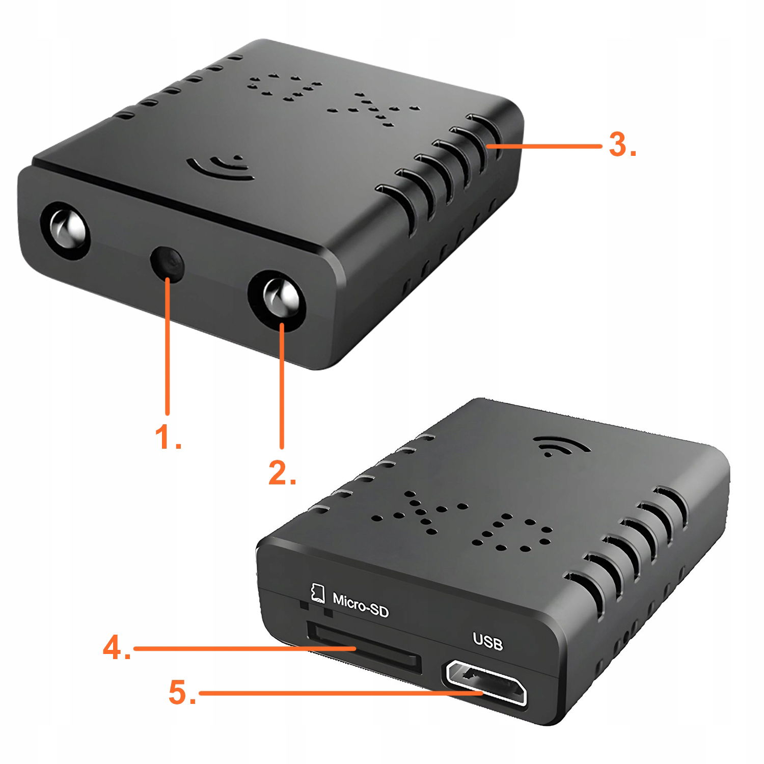 Rozdzielczość 1280x720; 1920x1080p Format wideo: AVI Minimalne wymagane oświetlenie: 1LUX Detekcja ruchu: Tak Nagrywanie nocne: Tak Ilość diod IR: 2 Nagrywanie dźwięku: Tak Kąt widzenia: 110° FPS: 30 Czujnik: CMOS Zasilanie: DC 5V 1A Wbudowana bateria: Brak Obsługa kart micro SD: 8 - 128 GB Aplikacja do obsługi kamery: iWFCam Wymiary: 3,8 x 3,2 x 1,1 cm✅ WIELOFUNKCYJNA KAMERA CYFROWA W JAKOŚCI FULL HD