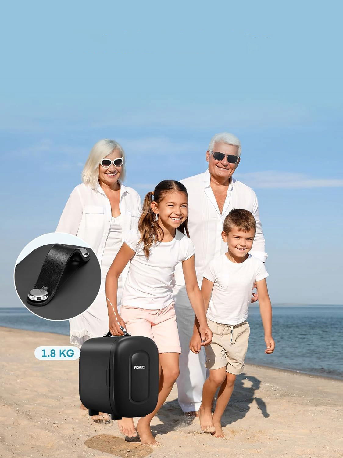 Urządzenie wyposażono w wtyczkę 110–240V AC, 9V DC oraz port USB, co umożliwia korzystanie z lodówki zarówno w domu, biurze, jak i w samochodzie. To doskonałe rozwiązanie na podróże, kemping, wyjazdy nad jezioro czy długie trasy autem.