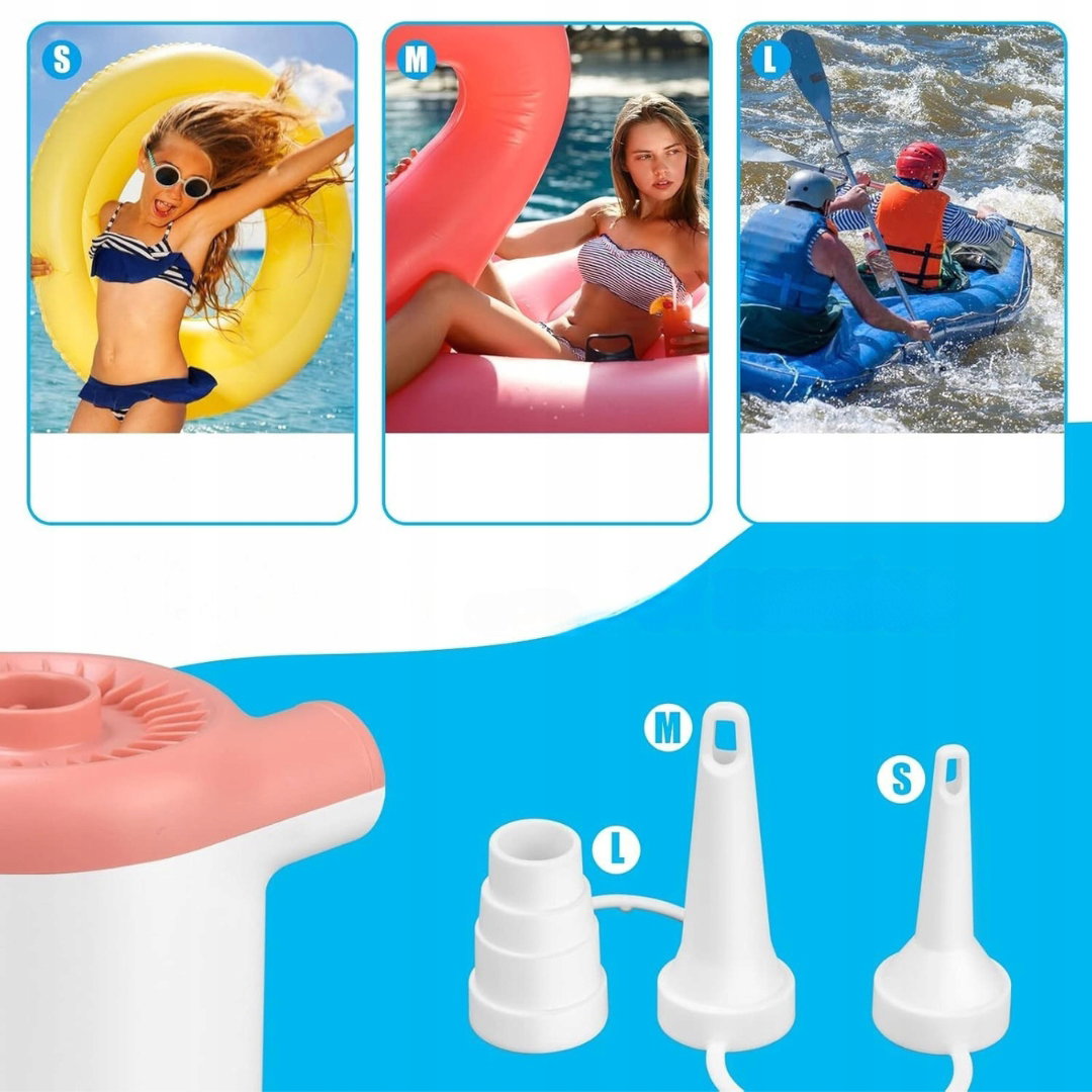 - Trzy rozmiary dysz (S, M, L): umożliwiają idealne dopasowanie do różnych produktów dmuchanych. Dysza S jest przeznaczona do małych akcesoriów, takich jak zabawki dmuchane czy koła do pływania. Dysza M sprawdzi się przy piłkach do jogi, pływakach i basenach. Natomiast dysza L jest idealna do dużych produktów, takich jak materace powietrzne, łodzie czy inne większe akcesoria dmuchane. Dzięki temu pompka jest niezwykle wszechstronna i dostosowana do różnych potrzeb.