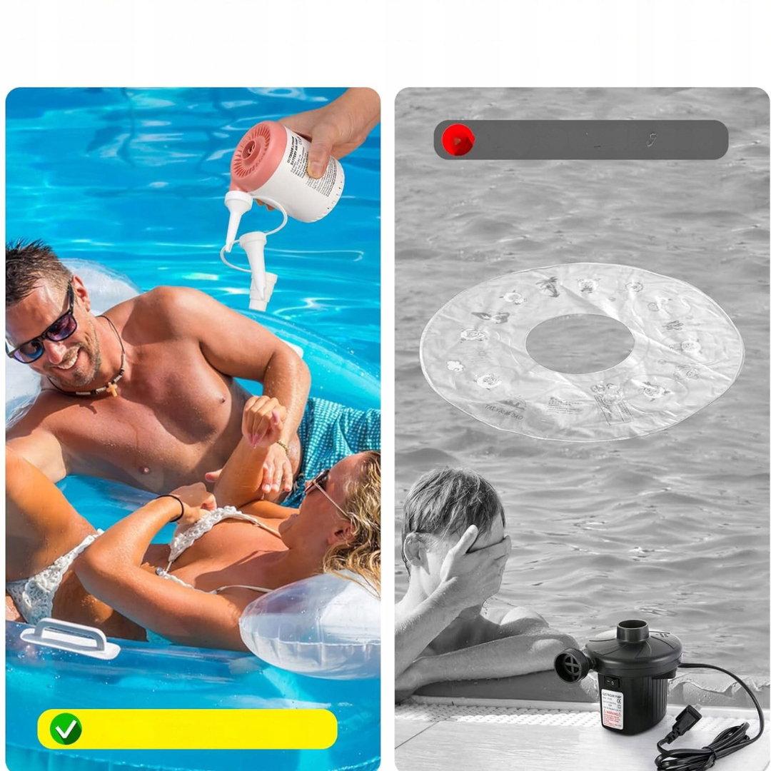 - Zastosowanie: elektryczna pompka powietrza służy do szybkiego pompowania i odpompowywania powietrza z różnych produktów dmuchanych, takich jak materace powietrzne, baseny, koła do pływania, piłki do jogi, zabawki. Dzięki funkcji odpompowywania, pomaga zaoszczędzić miejsce przy przechowywaniu tych produktów.
